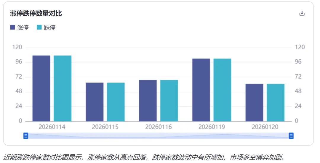 1月20日市场跌停个股23只5,涨跌停比例约为2.7:1(62:23)。回顾近期数据,1月16日涨停67家,跌停57家,涨跌停比接近1:1,显示空头力量一度非常强劲1。随后几日跌停家数有所减少,但1月20日再度回升至23家,表明空头力量并未完全消退,市场分歧依然较大。