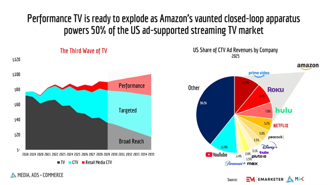 现在,亚马逊广告已经能拿到至少50%的广告支持型联网电视广告资源,这意味着闭环电视广告的时代真的来了。效果型电视广告的影响力将达到不容忽视的程度,开始吸引零售媒体领域此前从未有过的全国性媒体投资。