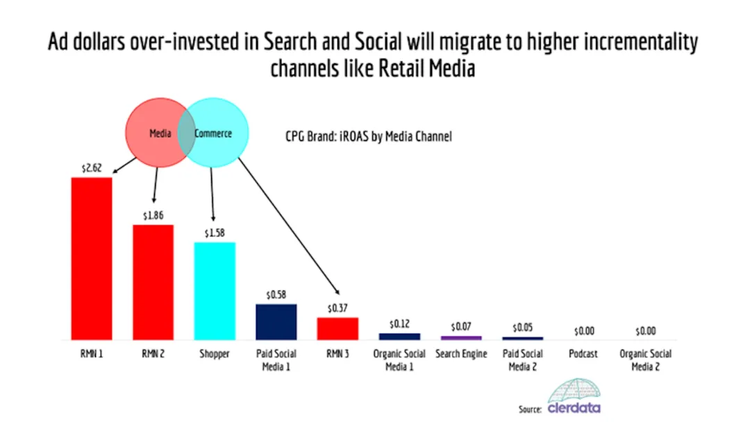 更关键的是,零售媒体在MMM模型里的“评分”一直很低:模型总会让营销人员把预算投到电视、Meta、YouTube、站外程序化广告这些传统渠道,即便这些渠道的触达效率已大不如前。但换个更科学的“增量衡量方法”(比如因果建模,就是通过对比“投了广告”和“没投广告”的效果,算清广告带来的额外销售额),结论就完全不一样:头部零售媒体网络在这类评估中,始终位列表现最佳的渠道之一。