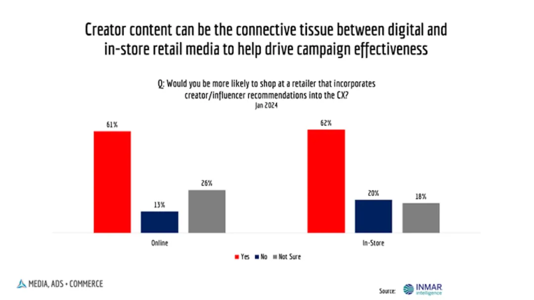 Inmar Intelligence零售媒体副总裁Leah Logan也提到:“现在零售媒体网络团队压力很大,一方面要配合商户团队,另一方面还要满足用户体验团队的要求,核心是要让广告融入整个购物旅程。目前最大的短板就是‘内容不够好’,而达人视频刚好能补这个缺口:既能给零售媒体网络提供优质的创意素材,又能帮广告主实现‘让用户发现品牌’‘讲好品牌故事’‘打动用户下单’这几个核心目标。”