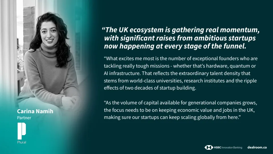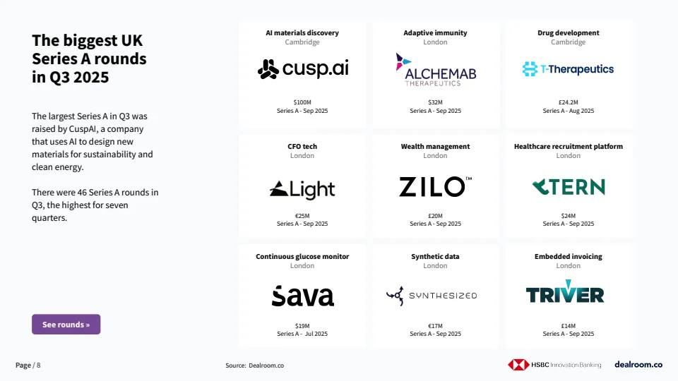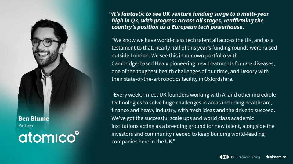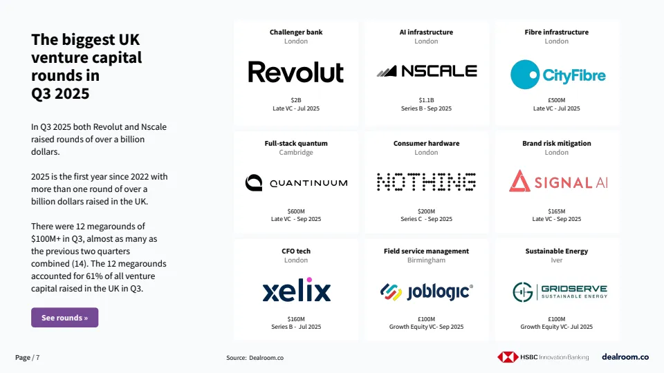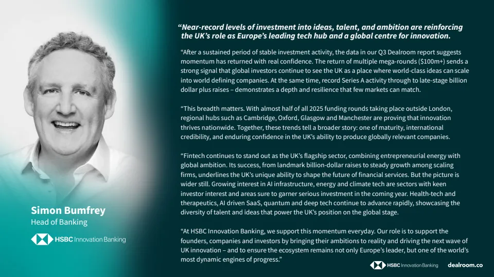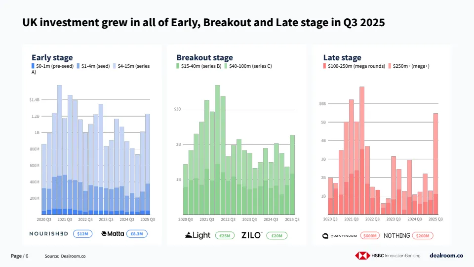 投资结构上,早期、成长期与后期融资在第三季度全面增长,显示资本风险偏好正在系统性修复。单季出现12笔1亿美元以上的大额融资,占当季总融资额的61%,其中两笔融资规模超过10亿美元,这是英国自2022年以来首次在一年内出现多笔十亿美元级别融资,标志着全球资本对英国创新资产的信心显著增强。