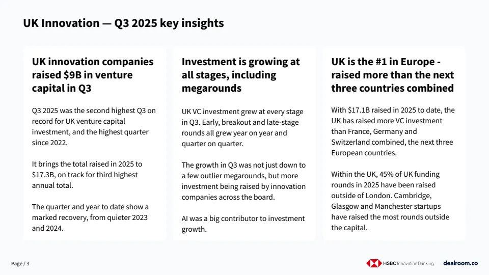 综合判断,第三季度的数据表明英国创投市场已从周期底部进入新一轮扩张初期。未来趋势上,超大额融资、AI与深科技主导、区域化创新扩散将成为主要特征。若宏观金融环境保持稳定,英国有望在未来一至两年内进一步巩固其作为欧洲创新资本核心枢纽的地位。