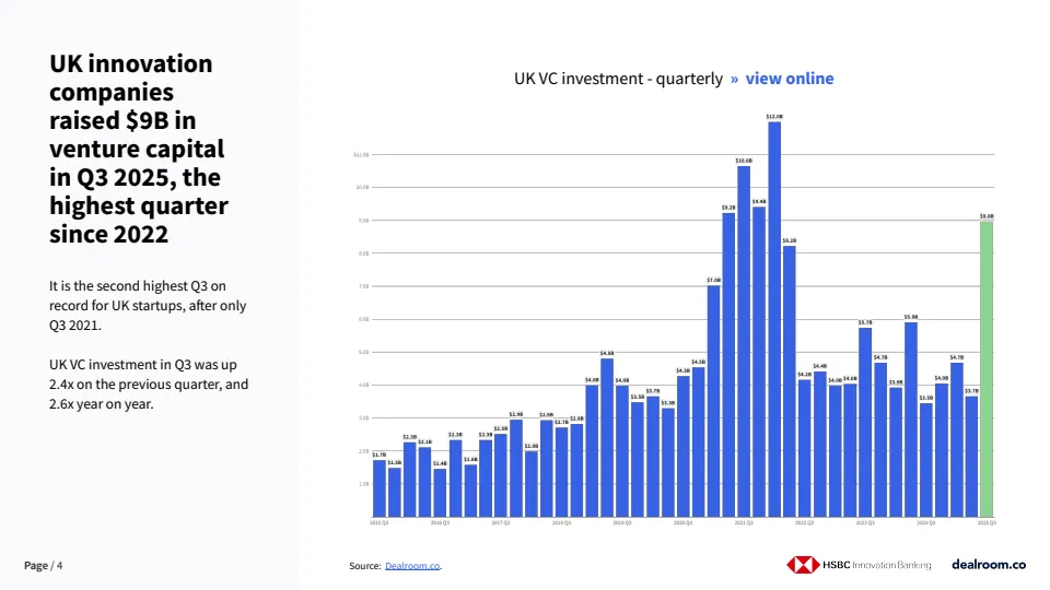 2025年第三季度,英国创新企业风险投资出现显著回暖。单季融资规模达到90亿美元,为2022年以来最高季度水平,也是历史第二高的第三季度,仅次于2021年同期。季度环比增长2.4倍,同比提升2.6倍,显示在经历2023年至2024年的相对低迷后,英国创投市场已进入明确的修复通道。