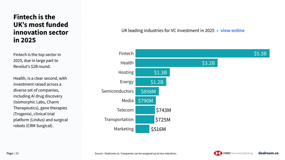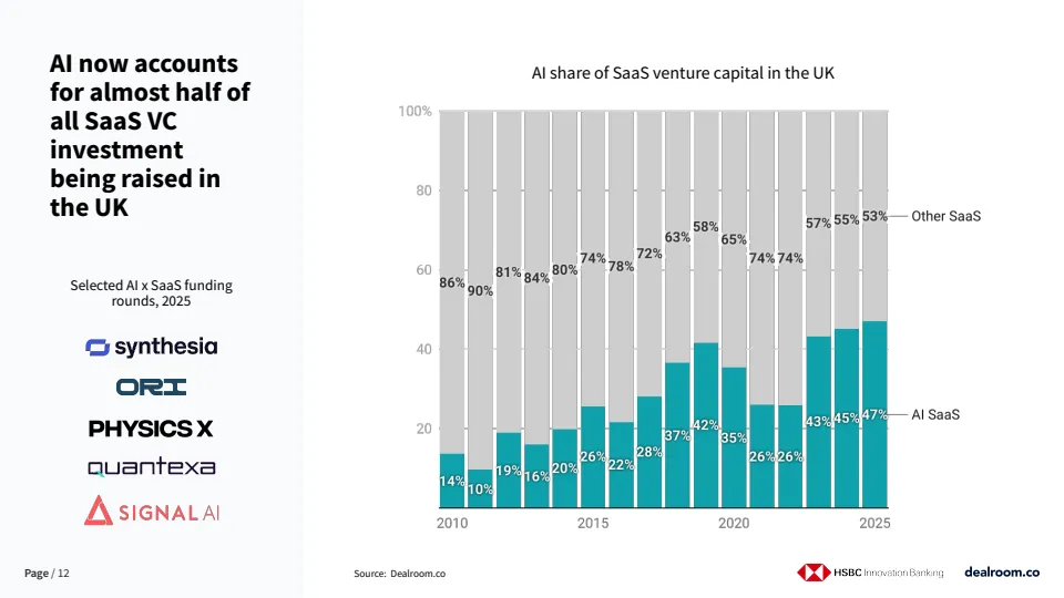 行业分布上,金融科技以约53亿美元融资规模位居首位,主要受超大规模融资拉动。医疗健康以约32亿美元位居第二,覆盖AI药物研发、基因疗法、临床试验平台与手术机器人等多个细分方向。同时,人工智能相关SaaS投资占比已接近英国SaaS融资总额的一半,成为推动整体增长的核心变量。