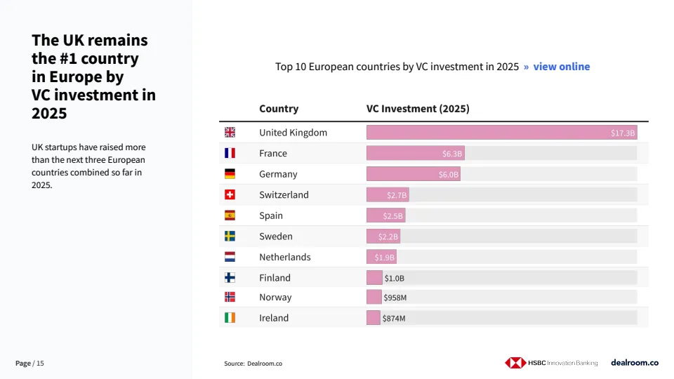 从欧洲比较看,英国继续稳居风险投资第一大市场。2025年至今,英国融资规模超过法国、德国和瑞士三国总和,显示其在资本深度、项目密度与退出预期方面仍具压倒性优势。这一领先地位为英国在高端科技与前沿产业的长期布局提供了资金基础。