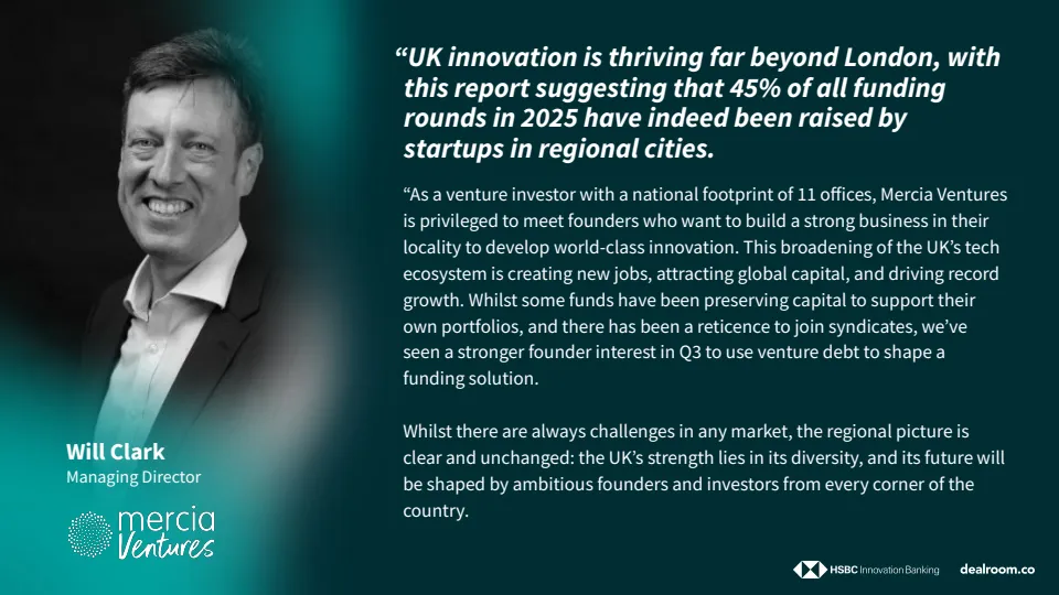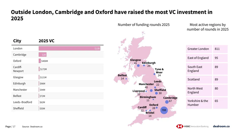 区域结构方面,伦敦以外城市的活跃度持续提升。2025年约45%的融资轮次发生在伦敦之外,剑桥、牛津、格拉斯哥与曼彻斯特成为最具代表性的区域中心。这表明英国创新体系正由单极向多中心演进,有助于缓解人才与资本的地域集中风险。