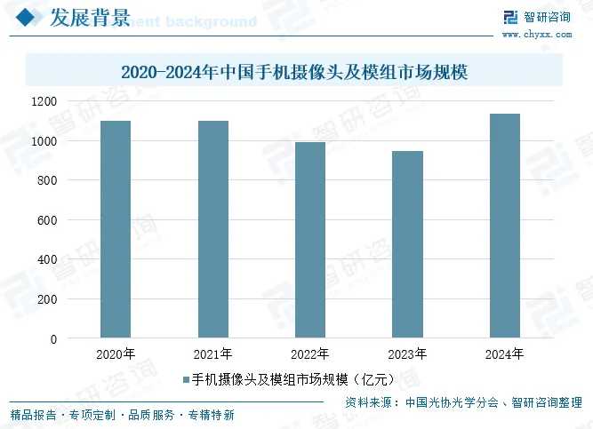 随着智能手机普及率的提高,消费者对手机拍照功能的需求日益增长。手机已经成为人们记录生活、分享情感的主要工具,尤其是短视频和直播的兴起,使得用户对视频拍摄的需求大幅增加,进一步推动了手机摄像头行业的发展。近几年,受经济下行压力加剧,智能手机承压发展,导致手机摄像头及模组市场规模呈波动态势,2024年智能手机市场回暖直接带动手机摄像头及模组的产销量增长。据中国光协光学分会统计,2024年度中国的手机摄像头及模组市场规模达到1135亿元,增长20%,超过了2021年的规模。