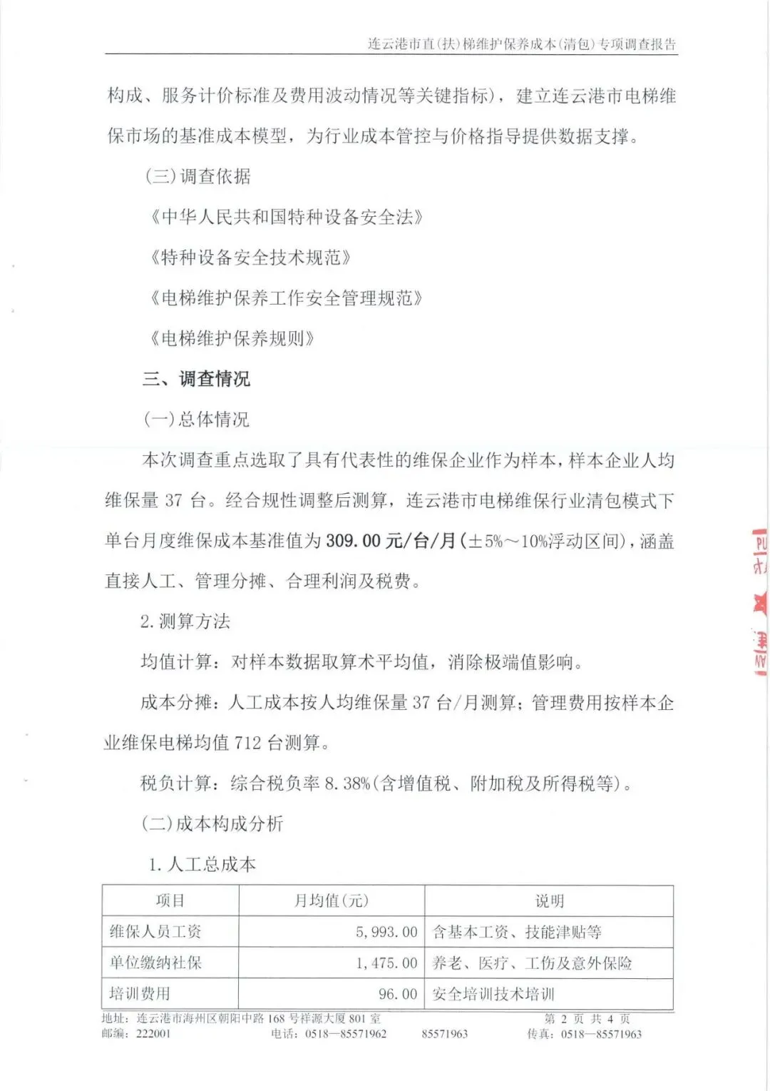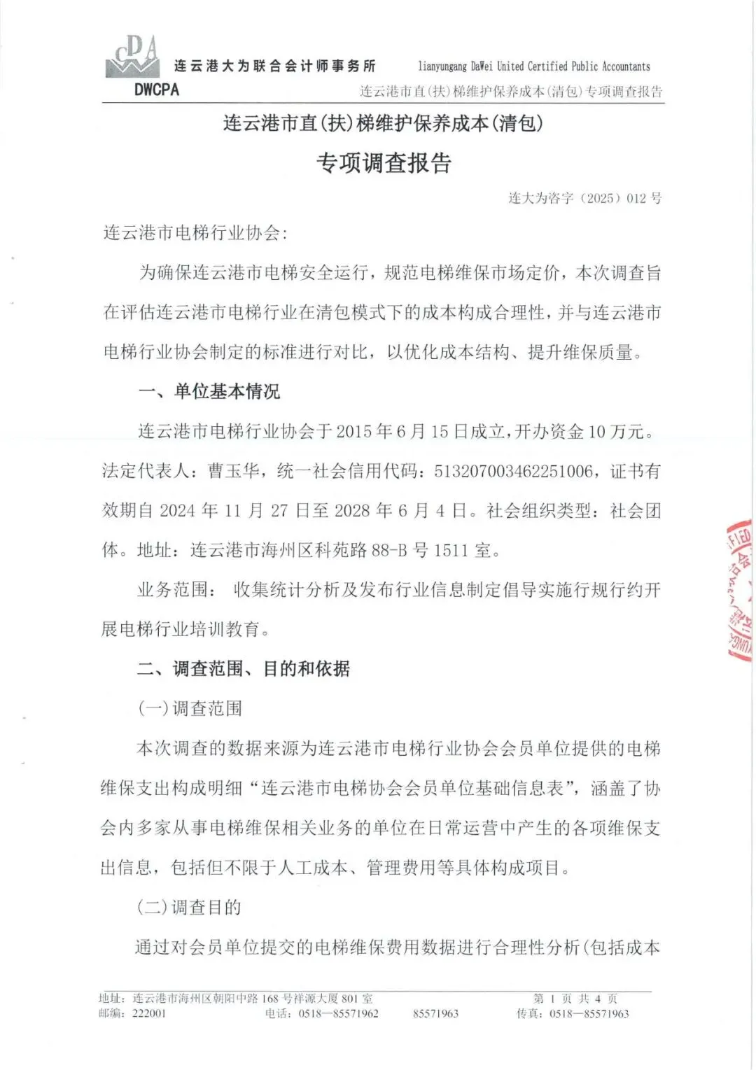 为深入贯彻落实国家发展和改革委员会、国家市场监督管理总局联合发布的《关于治理价格无序竞争维护良好市场价格秩序的公告》精神,积极响应国家关于规范市场行为、促进公平竞争的号召,连云港市电梯行业协会在深入调研、座谈及广泛征集意见的基础上,委托连云港市大为联合会计师事务所,对会员企业的电梯维保成本开展了专项调研工作。