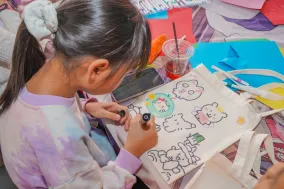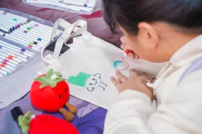 社工引导青少年们在空白帆布袋上画上自己的喜欢的场景或IP。一对姐弟趴在桌上画了一个多小时,姐姐描绘着情绪玩偶们的奇幻旅程,弟弟则涂鸦着开心的表情。他们的妈妈在一旁耐心陪伴,用行动支持着孩子的情绪表达。这个帆布袋,从此将成为承载他们独特记忆的专属艺术品。