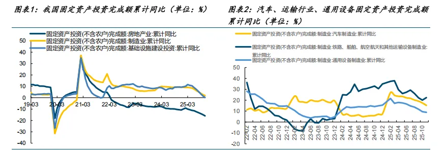 2025 年固定资产投资整体承压,制造业和基建投资呈现出前高后低。1-11 月份,我国基建固定资产投资同比增长 0.13%,受益于超长期特别国债、专项债等政策工具对清洁能源项目的倾斜,新基建投资韧性强;而受到地方财政收支矛盾、债务化解压力影响,传统基建投资力度有所减弱。1-11 月份,我国制造业固定资产投资同比增长 1.9%。年初制造业投资凭借政策红利和产业升级需求,保持强劲增长。年中以来地方化债提速,导致政府支持制造业相关项目的可用资金减少,制造业投资增速出现明显下滑。制造业固定资产投资结构上,高端制造与装备业成增长引擎,高技术制造和装备制造领域始终保持高景气度。
