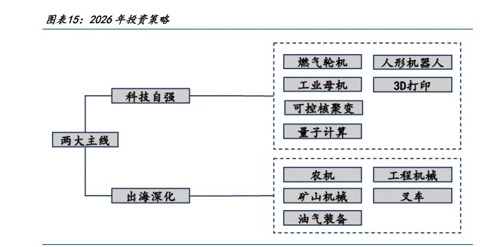 在国内制造业转型升级、国产品牌全球竞争力提升的背景下,我们建议关注两条主线。科技自强。以 AI 为代表的科技革命成为全球新的增长引擎、也是大国博弈的重要着力点。关注燃气轮机、工业母机、可控核聚变、量子计算、机器人、3D 打印等。出海深化。在以挖掘机为代表的优势产品实现连续出口高速增长之后,出海进入新的阶段,工程机械乘胜追击,农机、矿机出海有望接力高增长,叉车、油气装备深耕高价值量市场。