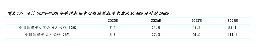 AIDC 加剧全球电力消耗,催化燃气轮机需求上行。根据高德纳,目前全球数据中心数量高速增长,导致电力需求高增,2023-27 年全球 AI 服务器用电量将从 195 太瓦时提升到500 太瓦时。燃气轮机发电凭借项目建设速度快、发电稳定、启动速度快,成本低等优势,未来有望成为 AI 数据中心领域供电的重要方案,看好燃气轮机长期需求上行。2019-2023年全球燃气轮机销量从 39.98GW 提升到 44.1GW,CAGR 为 2.49%,从 2024 年开始,燃机行业规模加速提升。我们预计 2025-28 年,美国数据中总功耗约从 8.9GW 提升到 111.3GW,对应燃机需求为 4.1GW-57.9GW,26-28 年增速分别为 219%/135%/88%。