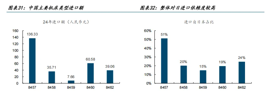 目前国产替代空间依旧较大,根据机床工具工业协会数据,24 年中国金属加工机床进口额 54.9 亿美元,其中金属切削机床进口额 48.3 亿美元,折合人民币 343.9 亿元人民币。24 年金属切削机床消费额为 1163 亿元人民币,进口依存度约为 30%。