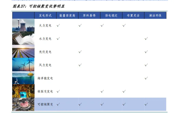 核聚变兼具“高能量密度、原料易得、布置灵活、安全环保”等优点,相较于其他主流发电方式有着明显优势。以氘氚(D-T)聚变为例,聚变单次反应即可释放 17.59MeV 能量,将现有能源体系的能量密度提升了千万倍;此外,核聚变安全环保,原料易得,发电环境无特定要求。对于能源行业,核聚变不仅意味着技术迭代,更是对能源范式的降维打击。