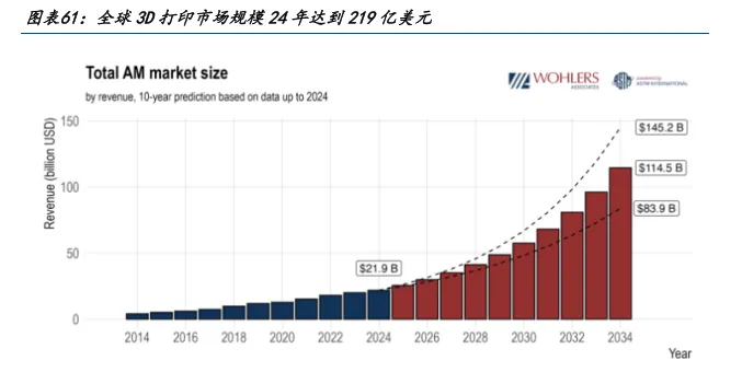 根据 Wohlers 数据,24 年全球 3D 打印行业总收入达 219 亿美元,同比增长 9.1%,其中材料销售为 44 亿美元,打印机销售及服务收入 60 亿美元,打印服务收入 101 亿美元,软件销售收入 14 亿美元。预计后续 10 年的行业复合增速约为 18%,市场规模在 2034 年达到1145 亿美元。