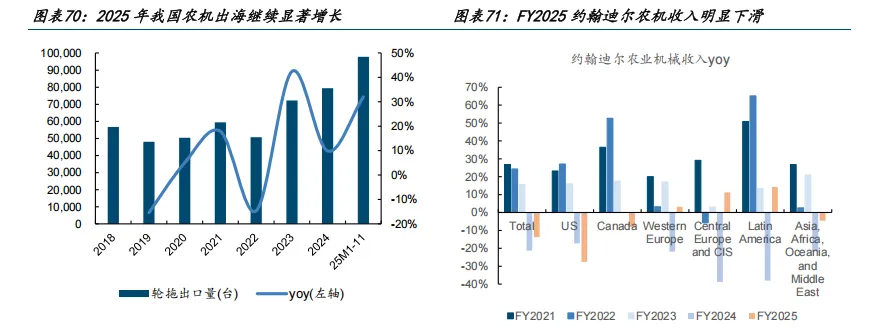 2025 年农机出口逆势增长,主要来自份额明显提升。根据海关总署,2025 年前 11 月,全国出口轮拖 9.8 万台,同比增长 32%,其中功率在 18kW 以上的中大拖增速为 39%。我国农机出海增长主要来自市占率的提高,因为根据全球农机龙头约翰迪尔 2025 年报,全年约翰迪尔农机收入下滑 14%,在中国企业出海较多的亚非拉地区增长也相当缓慢。全球农机市场的不景气并没有阻挡中国农机出海的步伐。