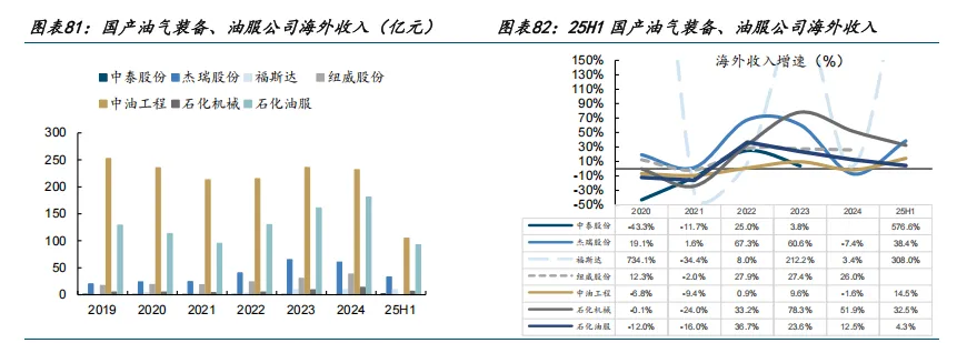 油气装备、油服出海已成趋势,国内油气装备和油服公司海外业务持续增长。25H1 中泰股份、杰瑞股份、福斯达、中油工程、石化机械、石化油服海外收入增速分别为 576.6%、38.4%、308.0%、14.5%、32.5%、4.3%。