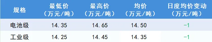 今日碳酸锂情绪持续降温,价格持续下跌,本次碳酸锂价格大幅调整的主因或是由于短期内市场涨幅过高,调整下的压力释放,价格下跌后,市场成交出现一定程度上的改善。预计短期内碳酸锂现货市场价格会在13万元/吨-15万元/吨之间宽幅震荡进行。