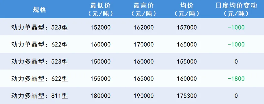 今日三元材料市场价格窄幅下跌,原料端的成本支撑减弱,节前备货计划暂未启动,三元材料企业多持观望态度,企业陆续商谈下月订单,需求端有小幅回落的趋势,预计短期内三元市场价格持稳为主。