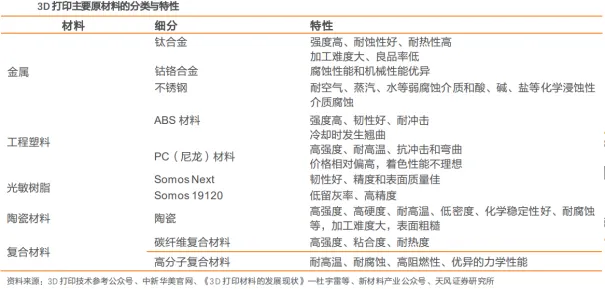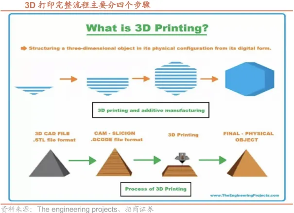 3D打印(增材制造)是一种以数字模型文件为基础,通过逐层堆积材料(如金属粉末、光敏树脂、工程塑料等)来制造实体物品的增材制造技术。区别于传统减材制造(如切削、打磨、雕刻)“去除材料”、等材制造(如注塑、冲压、铸造)“材料变形”的思路,3D打印核心是“从无到有、层层叠加”,完整流程主要分为四个核心步骤:数字建模:生成3D模型文件。首先通过CAD软件(如SolidWorks、Blender)设计,或用3D扫描仪获取物体的三维数字模型,最终导出为STL格式文件(3D打印的通用模型格式)。切片处理:转换为打印指令。用切片软件(如Cura、PrusaSlicer)将STL模型“切成”数百层的二维截面,同时设置打印参数(如层高、速度、支撑结构),最终生成GCODE格式文件(打印机能识别的控制指令)。实体打印:逐层堆积材料。将GCODE文件导入3D打印机,打印机根据指令,通过熔融挤出/光固化/烧结成型等方式,将材料(塑料、树脂、金属等)逐层堆积、固化,完成实体的成型。后处理:优化成品效果。打印完成后,去除支撑结构、打磨抛光、喷涂上色等,最终得到符合要求的实体物件。3D打印相比传统生产模式优势明显。以金属3D打印为例,相比传统精密加工的“减材”制造,3D打印的“增材”制造大幅提升材料利用率,尤其对于贵重材料,节省成本显著。同时,3D打印还具备新品研发周期短、实现复杂结构、实现一体化、小批量经济性高等等优点。3D打印在加工精度、表面粗糙度等方面,与传统精密加工仍存在较大差距;因此3D打印并非要取代传统加工,而是其重要补充。3、3D打印技术多向开花,不同材料+技术给予成品差异化特性3D打印技术多向开花,材料+技术工艺决定产品性能+应用。3D打印经过了40多年的发展历程,目前涵盖多种材料+技术工艺类型,能够适配不同行业及终端产品应用需求。3D打印材料是3D打印技术重要的物质基础,主要分为金属和非金属两类。3D打印材料的性能在很大程度上决定了成形零件的综合性能。3D打印发展至今,其材料种类已然高度丰富,从材料类别来看,3D打印材料可以分为金属与非金属两大类。一般而言,使用金属材料的成品强度高、延展性良好、制备成本高,能够广泛用于航空航天、模具制造、汽车等领域。而非金属材料主要包括光敏树脂、陶瓷材料等,其中工程塑料以成本低廉的特性广泛应用于消费端产品,光敏树脂材料则是以成品精度高的特性而广泛应用于精细零件的生产。3D打印材料+下游应用需求差异化背景下,多种加工技术工艺路线并存,金属打印SLS&SLM和非金属打印FDM&SLA为主流工艺路线。目前,国内外3D打印领域的工艺系统,其中应用最典型与成熟的有金属打印的SLS和SLM,非金属打印的FDM和SLA。SLS是目前研究较多的碳化物和氮化物的3D打印方法,DTM公司和EOS也在SLS工艺领域投入大量研究工作。SLM工艺的出现克服了SLS技术制造金属零件工艺过程复杂的问题,不仅成本较低,而且具有较强的生产灵活性,能够更好地适配航空航天、医疗等行业苛刻的性能要求。FDM则凭借成本低廉的工程塑胶+无需激光器等重要零部件,是消费级3D打印常用的工艺。SLA是目前3D打印技术中发展和推广最快的技术,制件精度高、表面质量及性能较好。3D打印在消费级和工业级各有千秋。3D打印具备多种技术路线,且应用场景差异较大。消费级场景主要以个人创作,教育和家庭为主,不需要较高的精度,注重产品性价比。当前尤其海外DIY文化盛行,且将3D打印引入在学生教育阶段,海外3D打印的消费市场快速增长,实现3D打印走入千家万户。工业级场景主要以生产制造为主,如生产磨具,金属零部件等。工业3D打印精度和速度要求较高,且材料更复杂和专业,因此设备成本较高,也成为当前智能制造不可或缺的一环。02