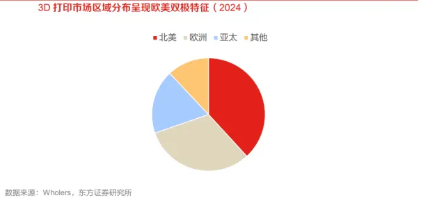 全球3D打印市场已初具规模。2024年全球3D打印市场(工业级+消费级,含3D打印设备、3D打印材料、3D打印制成品)规模达219亿美元,同比+9.31%,行业已从小众技术应用迈入规模化扩张阶段。从收入构成来看,打印服务(即销售3D打印制成品)收入占据半壁江山(46%)。消费级3D打印设备方面,2024年全球消费级3D打印机保有量已达1500万台量级。美国为第一3D打印市场,亚太市场增长更为迅速。2020年美国3D打印产业规模占全球比重34.4%,中国为10.8%。2024年全球3D打印细分行业增长率整体较高,其中3D打印材料居于首位(+35.21%),3D生物打印紧随其后(+33.64%),金属增材制造增速也达到15.2%。2024年全球量产3D打印机主要分为非金属(聚合物)打印机和金属打印机,分别占67.1%和29.7%。中国成为全球3D打印相对更具潜力市场。2015-2017年产业规模年均增速超30%,2024年达423亿元,近五年持续增长,产业发展进入规模化放量阶段,商业化落地成效显著。从产品结构来看,2024年打印设备和打印服务的营收占比较高,合计占比达76%。中国3D打印设备产量持续扩容,以出口为主。从出口端看,我国3D打印机呈现“量稳增、利提速”的特征,且市场聚焦北美地区,出口逻辑也同步从“以量为先”转向“以质补量”。国内市场超300亿,行业保持高速增长。2023年我国3D打印市场规模为367亿元,2019~2023年平均增速约25%,行业还处于成长趋势之中。下游来看,航空航天、消费电子、鞋模等行业正在加速使用3D打印技术,预计行业未来仍然可以保持较好的增长。美国企业在非金属打印领域布局较多,欧洲更多在金属材料领域,国内企业多点突破。2017年全球前三大专业级3D打印公司均为非金属3D打印为主。2020年,我国3D打印设备市场,联泰市占率16.4%,Stratasys市占率14.8%,EOS市占率13.1%,GE市占率9.8%,3DSystems市占率8.2%,华曙高科市占率6.6%,铂力特市占率4.9%。国内来看,联泰科技、华曙高科、铂力特等企业在工业级打印占据一定市场,创想三维、拓竹科技、智能派等企业在消费级领域表现出色。03