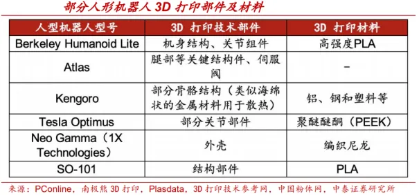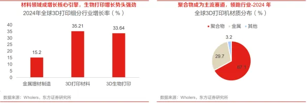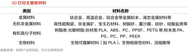 3D打印产业链上游主要包括打印材料、核心零部件以及辅助运行系统,中游为打印材料制造商、打印设备厂商、打印服务提供商,下游为各个应用领域。2、上游:3D上游材料级配件紧密贴合下游应用场景需求上游材料级配件紧密贴合下游应用场景需求。3D打印行业的材料选择紧密贴合下游应用场景的差异化需求,核心零部件配置则严格匹配具体技术路线的适配要求。2024年我国3D打印材料的销售占比中,钛合金、铝合金、不锈钢分别占20.2%、10.0%、9.1%,合计占比39.3%;PLA、PA、ABS占比分别为15.2%、14.1%、11.1%,树脂占比6.1%。环保打印材料PLA产能规模快速提升。PLA(聚乳酸)是一种环保型材料,由玉米、秸秆等生物质为原料,经过微生物发酵制成乳酸,再通过聚合反应得到。核心部件激光器国产化率提升,工业级3D打印软件仍由外企主导。作为激光雷达的核心组件,激光器的性能直接决定了3D打印系统的探测性能、成本及可靠性,近年来国产替代进程显著提速,国产激光器的市场份额持续稳步提升。工业级3D打印软件市场仍由外企主导,消费级3D打印软件一般为硬件厂商配套提供服务。3、中游:技术壁垒筑高核心地位,头部企业引领行业升级3D打印设备制造是中游技术壁垒相对更高的核心环节,设备商主导行业技术创新与产业升级,需研发生产桌面级、工业级等多元设备以匹配下游需求。全球3D打印设备行业中,美国Stratasys及中国拓竹科技、创想三维、铂力特、华曙高科等企业稳居头部地位,其技术迭代不仅拉动全产业链升级,更向上游传导需求、牵引原材料等配套产业发展,成为行业增长的核心引擎。工业级应用:3D打印产业规模增长的核心驱动力,一方面在于下游领域对增材制造技术产品的应用,另一方面在于对所有工业制造量产前产品验证环节的应用。下游终端覆盖航空航天、汽车、医疗、机器人、消费电子等多元领域,各领域需求与发展特点差异化显著。消费级应用:消费级3D打印机以操作简便、性价比高的优势,加速渗透个人与小微企业市场,核心采用FDM、SLA技术,主要应用于消费品(43%)、学术/教育(34%)、文创(10%)领域。操作门槛降低与性价比提升持续拉动需求,消费级市场正成为3D打印行业增长的重要支柱。07