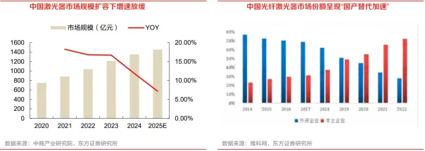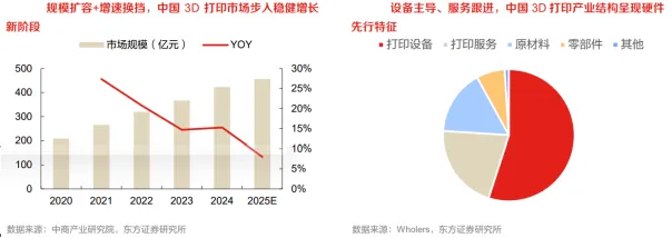 在市场发展方面,3D打印也处于高速增长阶段。据相关数据,2023年我国3D打印市场规模为367亿元,2019~2023年平均增速约25%。下游来看,随着航空航天、消费电子、鞋模等行业加速使用3D打印技术,预计行业未来仍将保持快速增长。