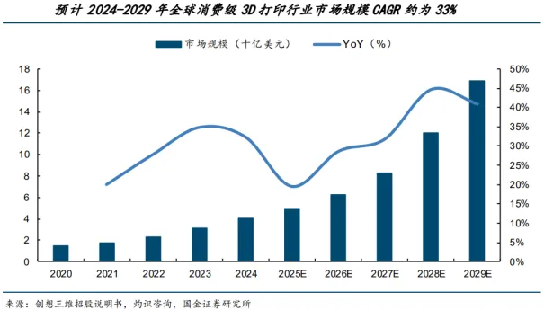 消费级市场的扩张,源于技术普惠与人性深层需求的碰撞,其增长逻辑已从“拥有一台打印机”转变为“创造万物的需求”。价格平民化:主流消费级FDM设备价格已从数年前的上万元下探至2000-3000元区间,零售价格进入大众电子消费品的价格带。速度与可靠性飞跃:以拓竹科技为代表的品牌,将打印速度大幅提升,并通过自动调平、堵塞检测、多色打印等功能,将打印成功率大幅提高。生态闭环简化:如MakerWorld(拓竹生态)等社区平台提供海量“一键打印”模型,用户无需掌握复杂的三维建模技能,即可轻松实现从创意到实物的转化。技术门槛的消失,是市场扩大的先决条件。(2)AI技术大幅降低创作与使用门槛,人造万物需求不断放大消费级3D打印的下游应用呈现高度发散和长尾特征,其核心驱动力是创造与个性化满足需求被充分激活。3D打印将生产工具交到每个人手中,激发了传统供应链无法满足的、海量的、碎片化的创造性需求。随着AI生成式3D模型的成熟,这一创造需求还将被进一步放大。个性化消费:打印独一无二的潮玩手办、家居装饰、个性化配件(手机壳、键帽),满足情感与审美价值。实用工具DIY:修复损坏的家居零件、制作特定工具(如自行车配件、园艺工具)、为宠物定制用品。在北美,车库创客文化深厚,3D打印已成为家庭工具箱的标准配置。教育与实践:成为教育的重要载体,将抽象概念具象化;同时也是设计师、工程师验证创意的低成本工具。另一方面,AI应用持续落地也大幅降低创作门槛,助力消费级3D打印快速普及。根据北京青年报,一般而言使用3D打印需要通过专业建模软件,掌握一定的建模知识,才能设计出自己想要的产品;或者可以通过爱好者网站分享的建模数据进行打印,但是可打印的产品款式有局限性,但AI技术的推广大大降低了3D打印机的使用门槛。根据中国日报25年8月报道,中国科技企业数美万物正式发布全球首款面向三维创作的高清模型生成工具——Hitem3D。这款产品通过上传一张图片,即可一键生成分辨率高达1536^3的高清三维模型,支持直接应用于工业设计、3D打印、数字孪生等多场景。Hitem3D背后采用数美万物自主研发的Sparc3D算法。不同于传统三维模型算法需先将数据压缩到二维,再重建为三维导致细节损失,Sparc3D基于稀疏卷积网络和3D变分自编码器(VAE)技术,实现三维数据输入与输出几乎无损。该方案将重建误差降低40%,而数美最新发布的Ultra 3D方案中,将让这个高速的3D生成框架提速6.7倍,大幅减少运算量,同时保留微观结构。在全球同类产品大多仅能生成1024^3分辨率模型时,Hitem3D实现1536^3分辨率雕刻级建模,首次让AI生成模型达到工业生产级别的细腻程度。根据中国日报网报道,北京的一家原创潮玩设计工作室负责人告诉记者,过去他们设计一个新形象的三维模型,需要团队建模师手动完成,复杂模型通常要耗时4-5天。很多创意因为建模时间长,生产排期就往后拖,有时想法还没打样出来就被市场替代。现在使用Hitem3D后,仅需上传一张概念图,几分钟内即可获得高清三维模型,直接对接3D打印或打样厂商。因此随着3D打印设备价格的降低以及AI建模软件的持续升级,消费级3D打印无论在硬件端和软件端均具备了打开市场空间的基础。2、消费级3D打印市场规模快速增长,行业竞争格局高度集中根据创想三维招股书与灼识咨询数据,2020-2024年全球消费级3D打印行业市场规模(按GMV计)由15亿美元增长至41亿美元,年均复合增长率约为28%;预计2025-2029年市场规模将由49亿美元增长至169亿美元,24-29年年均复合增长率约为33%。从设备端来看,2020-2023年全球消费级打印机年出货量基本维持在300万台左右,2024年突破400万台,2020-2024年年均复合增长率约为10.2%,预计到2029年有望达到1340万台,24-29年年均复合增长率约为26.6%。国产消费级3D打印机生产商崛起,市场格局高度集中。根据深圳商报报道,创想三维、拓竹科技、纵维立方、智能派四家深圳企业合计掌握全球入门级3D打印机九成市场份额。根据3D打印资源库和市场研究机构CONTEXT的报告显示,2024年入门级(售价≤2500美元)3D打印机是唯一实现增长的领域,出货量增长了26%,主要得益于拓竹和创想三维等品牌的强劲表现。相比之下,专业级(2500美元~2万美元)、中端(售价2万美元~10万美元)和工业级(售价≥10万美元)出货量同比分别下降15%、11%、17%。根据深圳商报和CONTEXT,2025年第一季度,全球入门级3D打印机出货量突破100万台,同比增长15%,中国供应商贡献了其中95%的份额:创想三维以39%的市场份额居首,拓竹科技出货量同比增长64%,纵维立方和智能派同样保持强劲增长。04