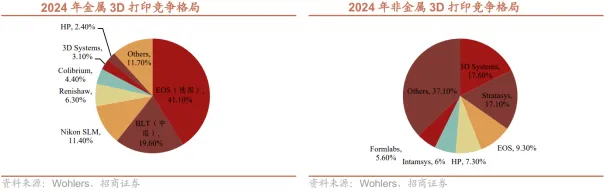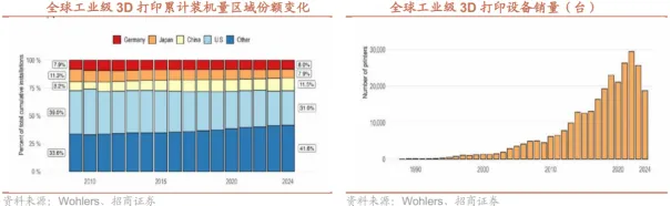 工业级3D打印的价值已超越补充传统工艺的初级阶段,正在小批量柔性生产和极端复杂结构制造两大场景中,建立起传统制造难以企及的壁垒。小批快返,实现零边际成本的敏捷制造。在航空航天、医疗器械、高端文创及科研原型等领域,产品往往具有高度定制化、小批量、快速迭代的特征。传统开模制造不仅前期投入巨大(一套模具成本可达数十万至数百万),且修改周期漫长。3D打印彻底摒弃了模具,实现了“设计即生产”。这使得企业能够以极低的试错成本快速验证产品设计、功能与市场反馈,特别适用于军工装备、医疗植入物、文创潮玩等。其核心逻辑在于,3D打印通过同一设备生产无限多样产品,实现了从“规模经济”到范围经济的跃迁,在个性化时代构建起独特的成本与效率护城河。攻克“异形件”极限,解锁材料与结构的终极性能。在追求极致性能的高端装备领域,许多关键部件因其结构极度复杂(如内流道、点阵结构、一体化拓扑优化形态等),或对材料性能有严苛要求,而成为传统减材制造工艺的禁区。航空航天:发动机燃油喷嘴内部的复杂涡流通道、钛合金轻量化舱体结构、带随形冷却流道的涡轮叶片。这些部件只能通过金属3D打印一体成型,在减轻重量的同时,实现散热效率与结构强度的倍增。精密器械:微米级孔隙的医用筛网、具有仿生结构的散热鳍片、机器人灵巧手内的复杂传动件。在这些场景中,3D打印不仅是“更优选择”,往往是“唯一解决方案”。它通过对材料性能的精确控制与对几何结构的极致释放,正在重新定义高端装备的性能天花板。全球工业级3D打印市场呈现“欧美主导、中国崛起”的竞争格局。从工业级3D打印机累计装机量区域份额来看,全球核心玩家仍以德国和美国企业为主,2024年美国仍以31%占据主导,德国以8%位居第三,值得注意的是中国从2009年的8.2%增长至2024年的11.5%。从工业级3D打印机销量来看,2024年全球销售量为18773台,同比下滑26.79%,主要系桌面级3D打印机对低端的工业级3D打印机替代。从竞争格局来看,金属3D打印中国铂力特发展迅速,高分子3D打印仍以美德为主。2024年金属3D打印市场,德国EOS以41%的市占率位居全球第一,中国铂力特市占率提升至20%位列全球第二;高分子3D打印市场美国3D Systems以17.6%位列第一,以色列Stratasys以17.1%位列第二。航空航天领域:核心刚需领域,渗透率持续提升。航空航天领域因零部件结构复杂、精度要求高、轻量化需求迫切,成为工业级3D打印的核心应用场景。航天领域,3D打印技术已成为火箭发动机等关键部件的核心生产方式。SpaceX率先将其大规模应用于龙飞船、猎鹰火箭制造,国内新研制的火箭发动机中60%以上零部件可通过3D打印生产,实现发动机组件数量减少80%,制造周期缩短70-80%,成本和重量降低40-50%,其中天鹊12B发动机3D打印零件占比达70%以上。航空领域,国际航空巨头空客、波音均大规模采用3D打印技术:空客A350XWB客机的碳纤维座椅支架通过3D打印制造,单架飞机减重超200公斤,年节省近百万欧元燃油成本。商业航天已成为核心主线:商业航天需将航天制造从任务型研制推向高频发射和批量交付,制造体系需满足快迭代、低成本、轻量化、高可靠性的核心需求,3D打印在这些维度具备核心优势。同时,商业航天要求结构件一体化以减少零件数量、焊点和装配工序,3D打印可将多零件、多焊接、多装配的长流程变为一次成型和少量后处理。商业航天对3D打印的需求主要来自两大主线:一是可重复使用火箭的高频验证迭代需求,二是卫星的批量交付需求。商业化层面,随着可复用发动机、液氧甲烷、渡线推进等进程及发射节奏加快,3D打印逐步从打样试制走向稳定批号生产,带动设备、粉末材料、后处理及检测能力系统性扩容。3D打印在航空航天及商业航天领域商业化落地的难点并非能否打印,而是批量交付,痛点在于工艺窗口和一致性(致密度、残余应力、变形控制等)、后处理体系、检测检验周期及质量回溯等方面。05