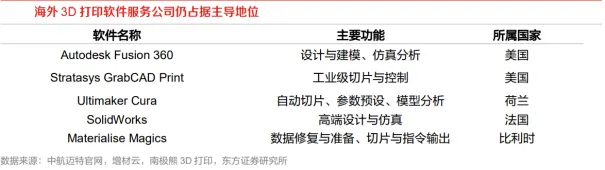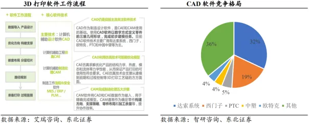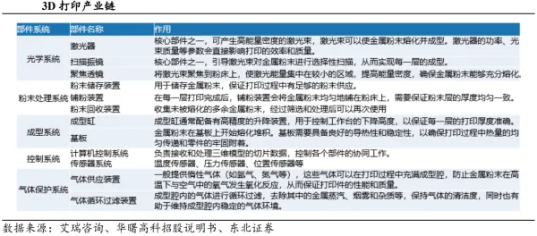 激光器为3D打印设备核心部件。以激光粉末床熔融技术为例,其核心部件包括光学系统、粉末处理系统、成型系统、控制系统、气体保护系统,而光学系统中的激光器和扫描振镜至关重要。对于数字光处理(Digital Light Processing,DLP)技术而言,光源、DLP芯片、控制系统、打印平台、光敏树脂等为其核心部件。总体而言,热源和控制为核心技术和核心部件,热源包括激光束、电子束、微束等。激光束已经成为金属3D打印最主流的热源。相对于电子束、微束等离子,激光束具有光斑细、成本低、可定向作用到指定材料位置等优点。常见的3D打印激光器包括CO2激光器、YAG激光器以及光纤激光器,其中CO2激光器为早期光源,但是金属的吸收率低。YAG激光与金属的耦合效率高、加工性能良好。总体而言,打印聚合物以CO2激光器为主,而金属粉末的3D打印主要使用光纤激光器。相关公司包括IPG、锐科激光、大族激光、创鑫激光、杰普特等。激光振镜是一种基于电磁驱动的高速精密光学偏转器件,通过控制电流驱动反射镜片快速偏转,从而实现对激光束方向的精确控制。激光振镜可用于光通信、医疗设备、机器视觉等领域。结构上看,振镜头主要元件为X/Y两个反射镜片、分别控制X/Y镜片旋转的两个电机,根据实际需求还可加入人机操作系统、编码器等。按照驱动方式分为动圈式振镜、动磁式振镜;按运动维度可以分为一维振镜、二维振镜、三维振镜;按反馈控制方式可以分为开环振镜、闭环振镜。激光加工为主要下游,海外企业占据高端市场。根据智研咨询数据,2024年我国激光振镜市场规模约17.9亿元,激光加工领域应用占比84.5%。格局角度看,国外企业占据高端市场,包括美国CTI、德国Scanlab和Raylase等,国内企业包括金橙子、大族激光、金海创、菲镭泰克、正时精控等。3D打印软件供应商呈现综合发展态势,在不断提升核心CAD软件技术性能的同时,开发更多集CAD、CAE、CAM等辅助软件于一体的综合软件。目前CAD软件技术主要厂商为达索系统,西门子,欧特克,PTC和中国中望等。06