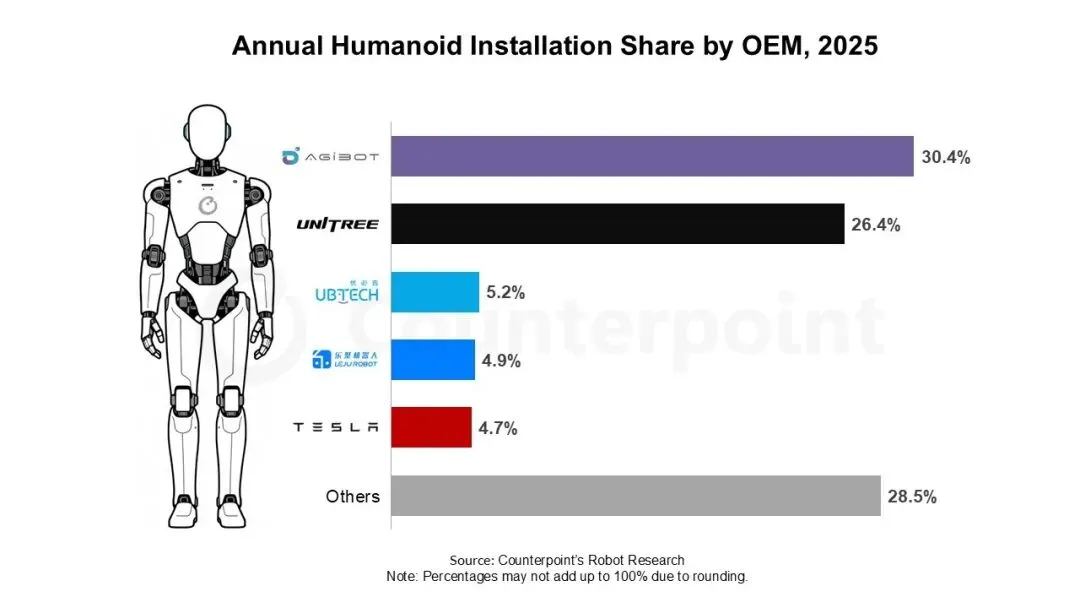紧随其后的是四足机器人制造商Unitree,2025年获得了27%的市场份额。