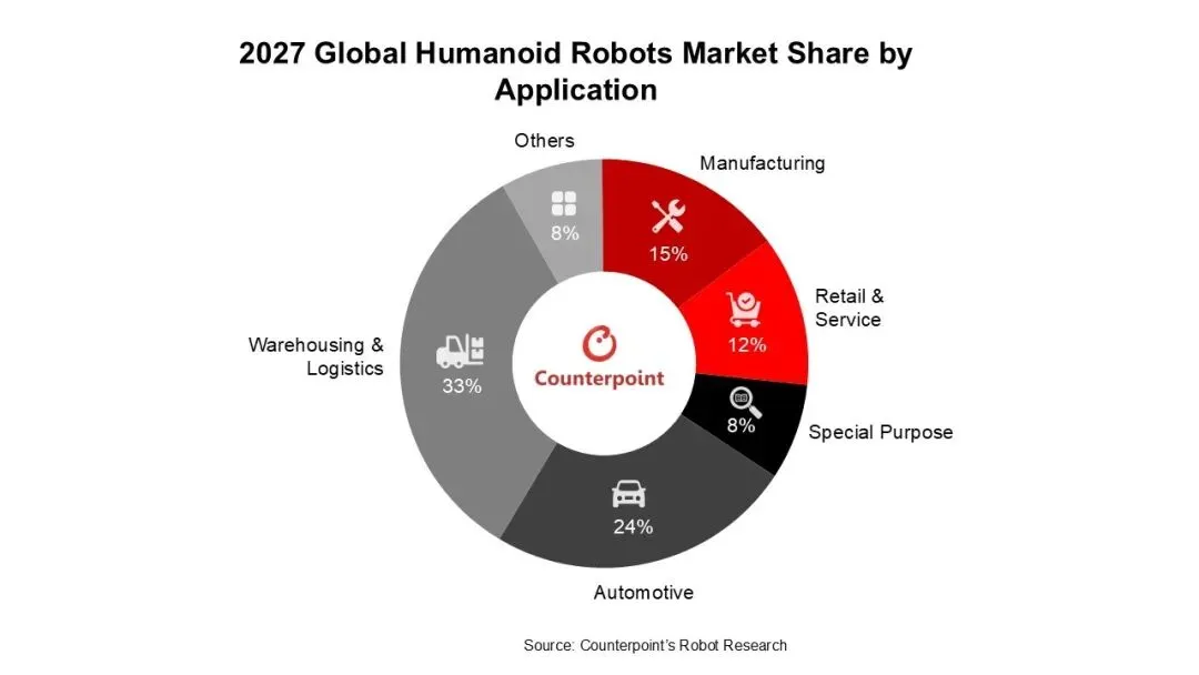 Counterpoint Research副总监Ethan Qi针对产业前景表示,预计到2027年,全球人形机器人的累计安装量将突破10万台。