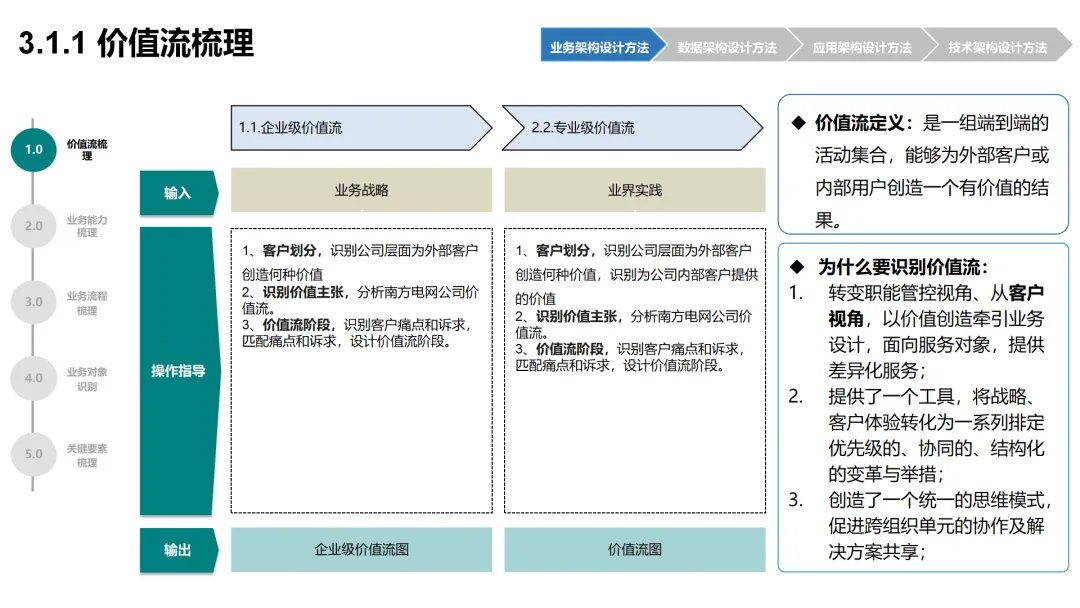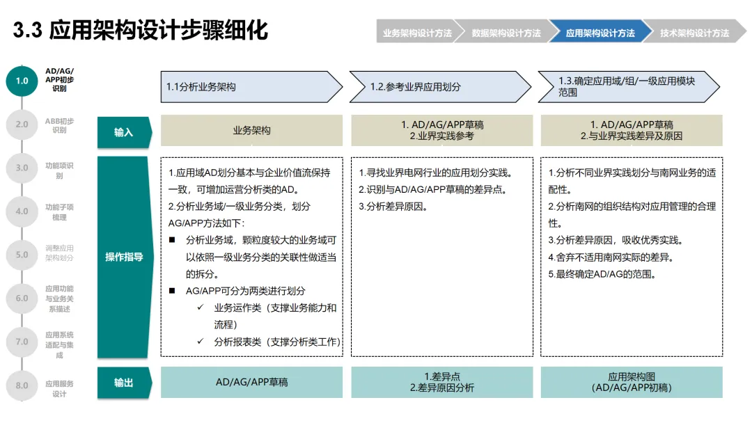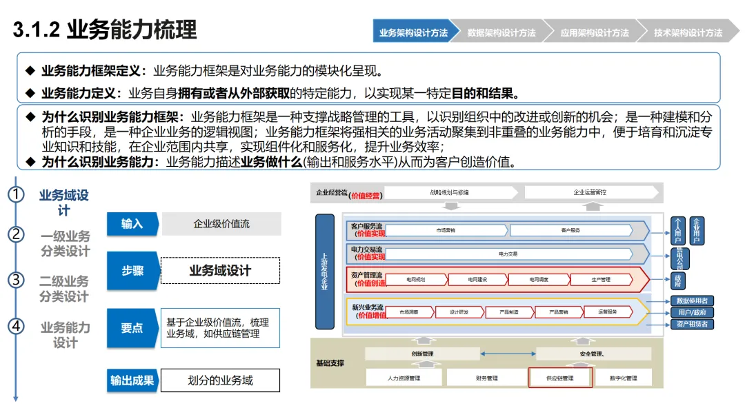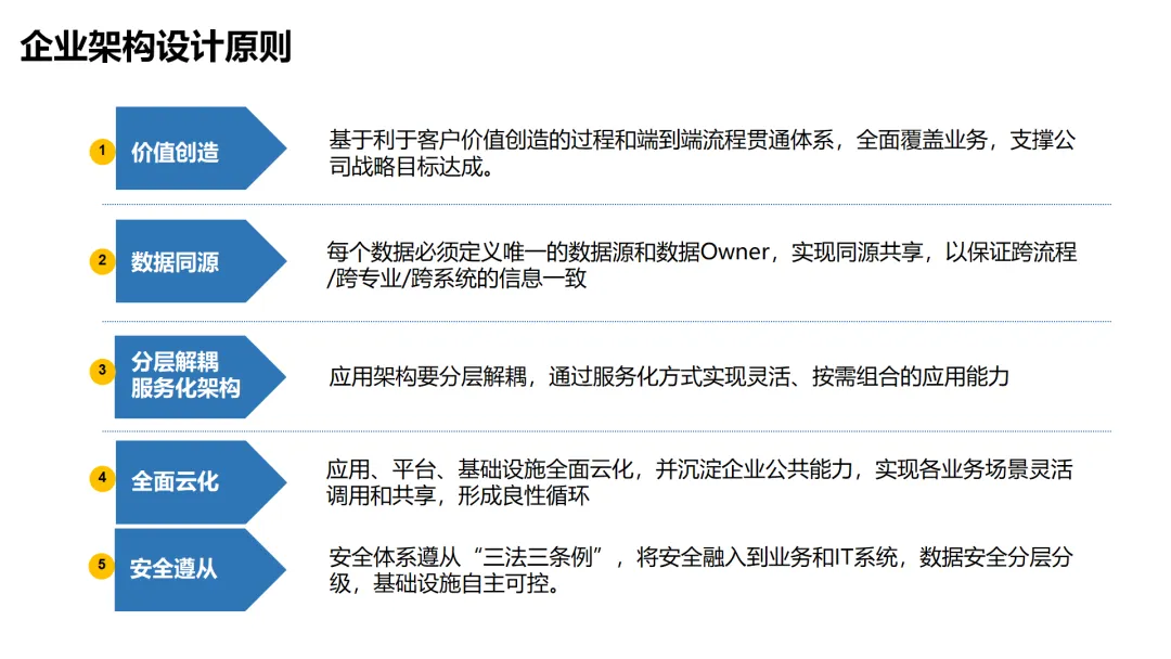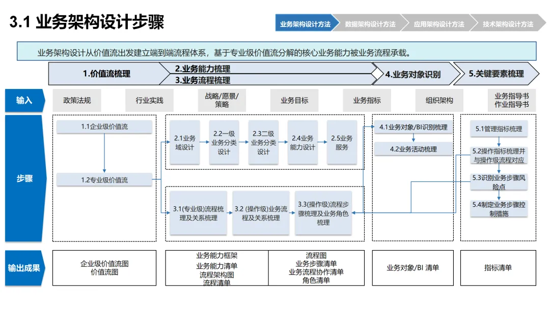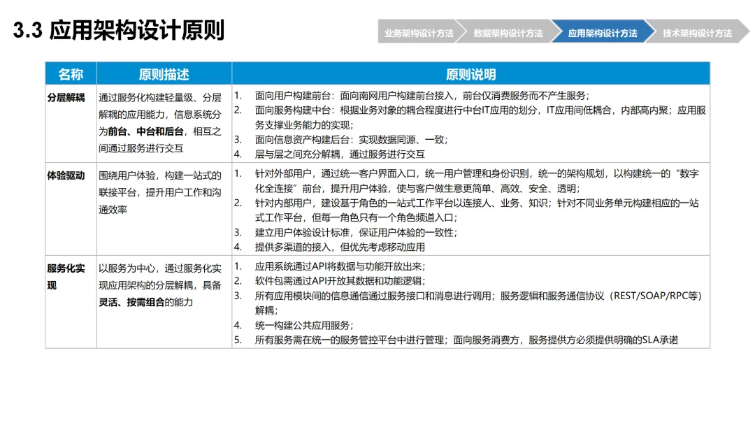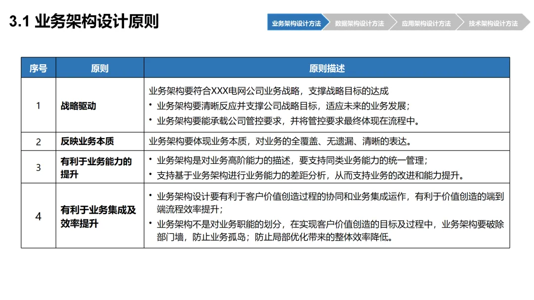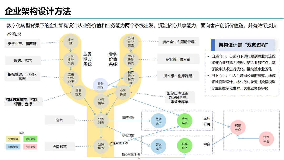 本方案围绕企业数字化转型背景下的架构设计展开,系统呈现了从现状分析到落地方法的完整体系。首先梳理了企业架构的现有基础,涵盖业务、数据、应用、技术四大架构的核心要素与规模,随后明确了企业架构的定义、价值及发展历程,融合 TOGAF 与 DDD 等方法构建了 CSG-EAF 2.0 总体框架,并确立了价值创造、数据同源、分层解耦等核心设计原则。重点详解了业务、数据、应用、技术四大架构的设计方法,包括各架构的定义、原则、步骤及具体实践样例,从价值流梳理、业务能力识别到数据模型构建、应用服务设计,再到技术平台搭建与部署节点规划,形成了闭环的设计流程。整套内容既有理论支撑,又有实操方法,还融入了电网行业的实践案例,为企业数字化转型中的架构规划与落地提供了全面指引。