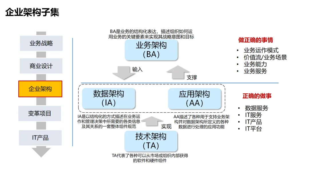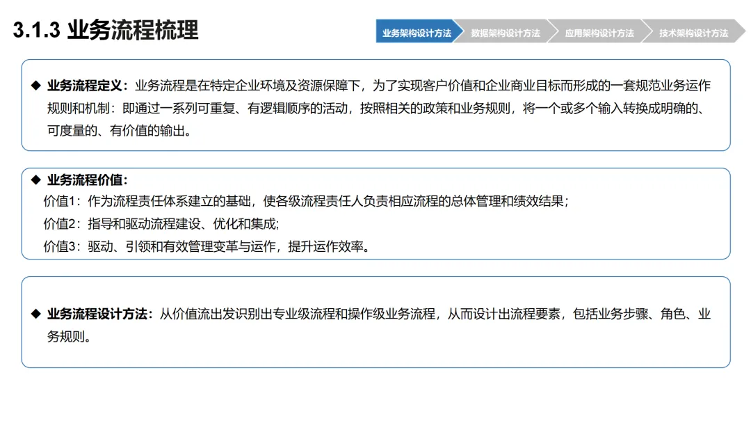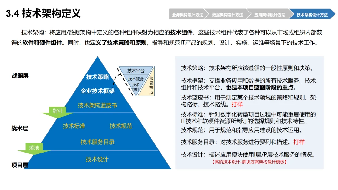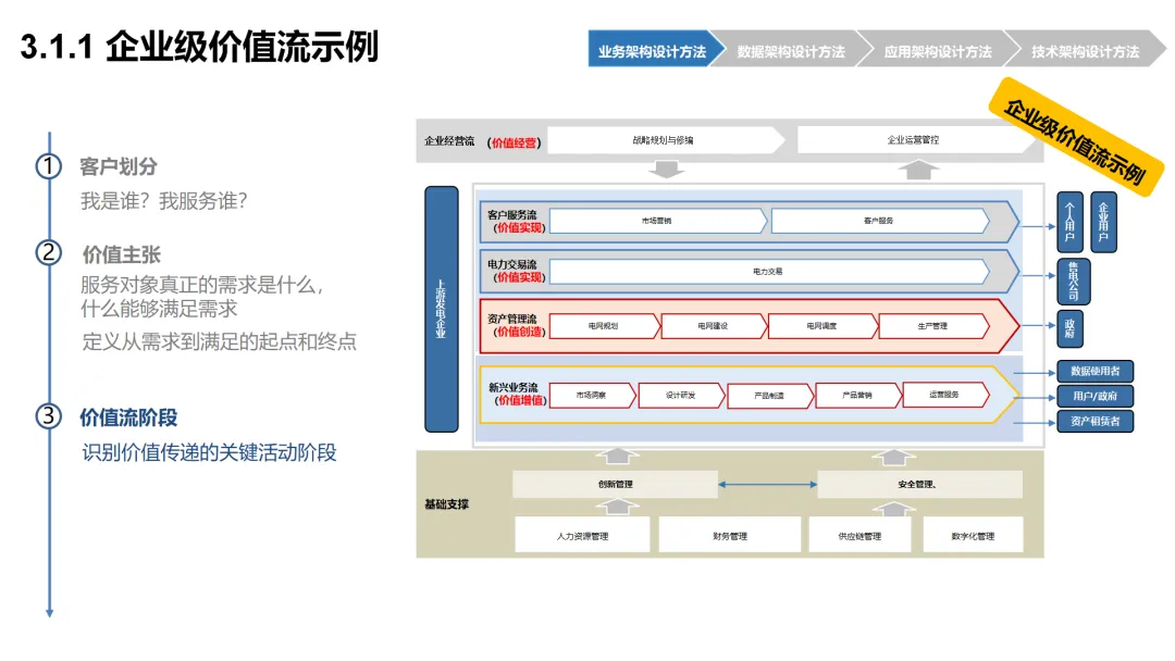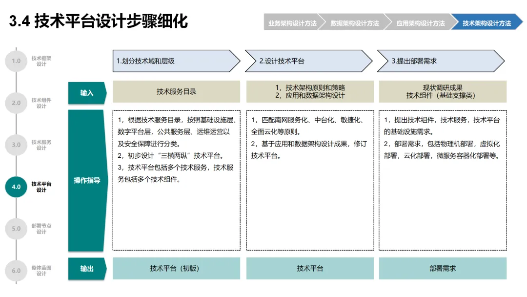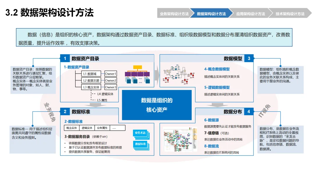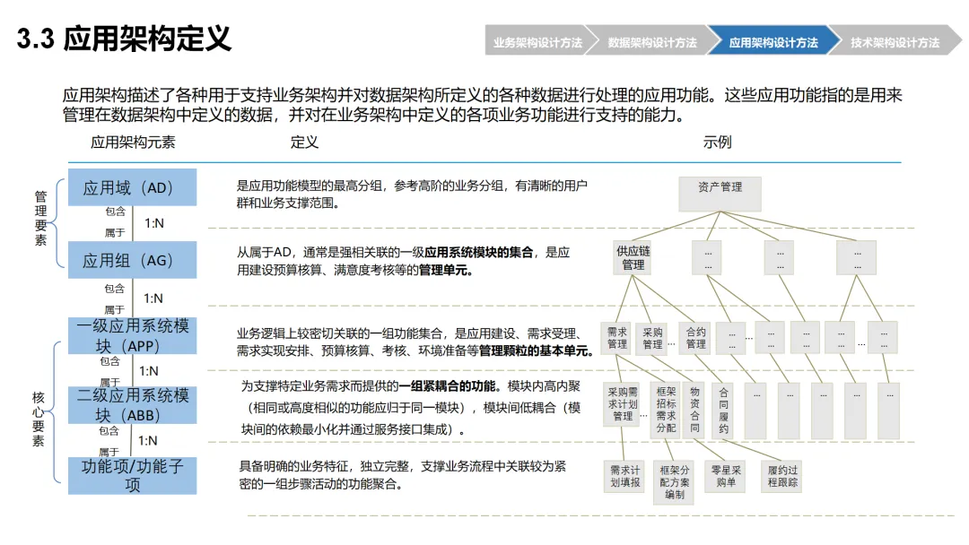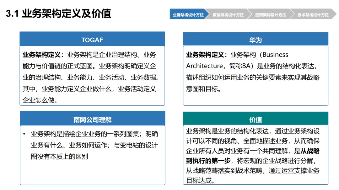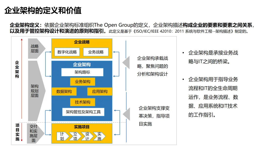 本方案围绕企业数字化转型背景下的架构设计展开,系统呈现了从现状分析到落地方法的完整体系。首先梳理了企业架构的现有基础,涵盖业务、数据、应用、技术四大架构的核心要素与规模,随后明确了企业架构的定义、价值及发展历程,融合 TOGAF 与 DDD 等方法构建了 CSG-EAF 2.0 总体框架,并确立了价值创造、数据同源、分层解耦等核心设计原则。重点详解了业务、数据、应用、技术四大架构的设计方法,包括各架构的定义、原则、步骤及具体实践样例,从价值流梳理、业务能力识别到数据模型构建、应用服务设计,再到技术平台搭建与部署节点规划,形成了闭环的设计流程。整套内容既有理论支撑,又有实操方法,还融入了电网行业的实践案例,为企业数字化转型中的架构规划与落地提供了全面指引。