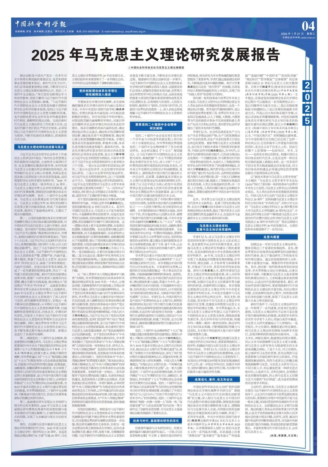 习近平总书记《在哲学社会科学工作座谈会上的讲话》中指出:“面对社会思想观念和价值取向日趋活跃、主流和非主流同时并存、社会思潮纷纭激荡的新形势,如何巩固马克思主义在意识形态领域的指导地位,培育和践行社会主义核心价值观,巩固全党全国各族人民团结奋斗的共同思想基础,迫切需要哲学社会科学更好发挥作用。”2025 年是马克思主义理论一级学科设立20周年,马克思主义理论学界立足学科发展积淀,紧扣时代发展脉搏,围绕党的创新理论体系化学理化研究阐释、党的二十届四中全会精神、马克思主义经典理论的当代现实新回应、马克思主义理论学科20周年的回顾与反思等主要方向纵深推进,形成了丰富的研究成果,既深化了基础理论研究,又强化了现实问题观照。