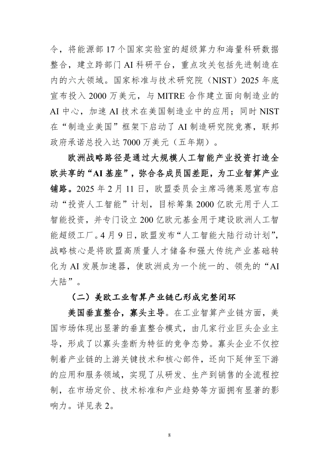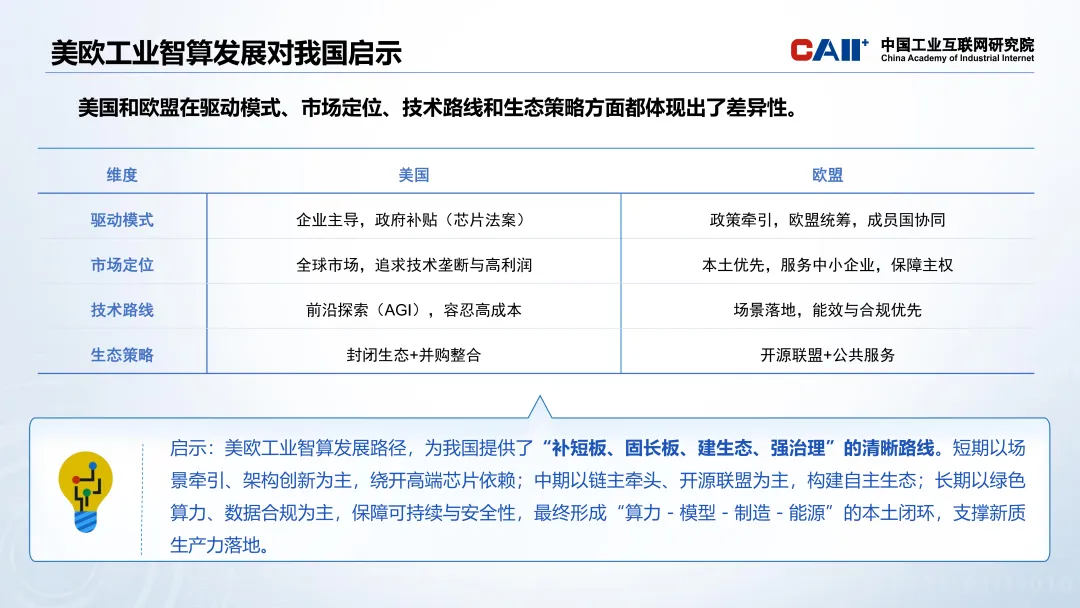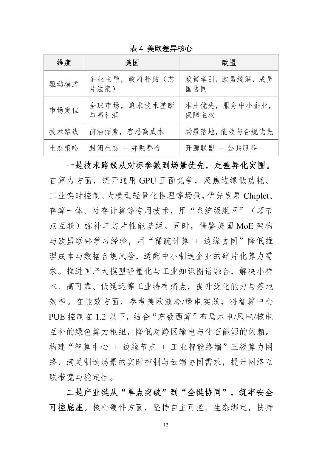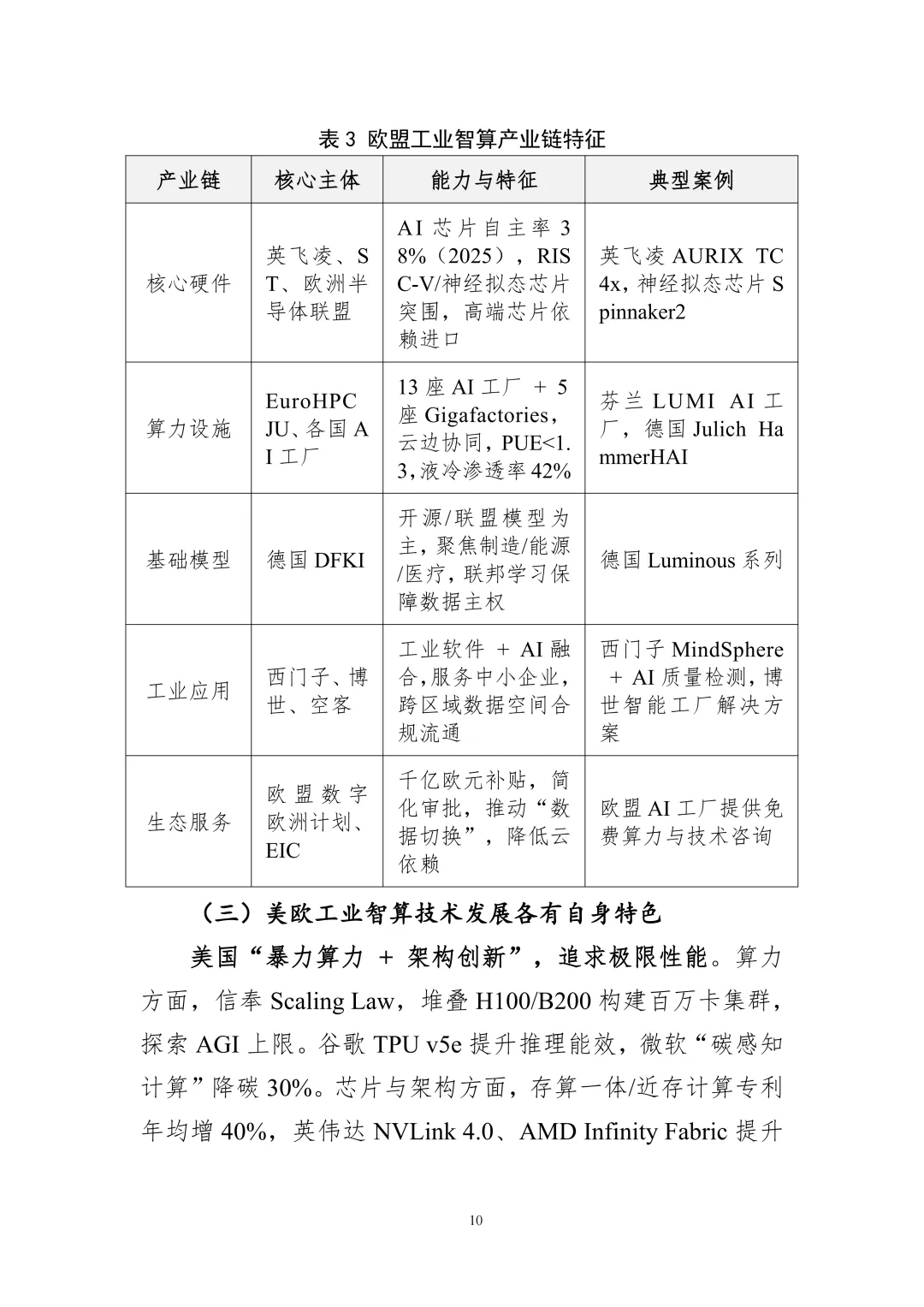 在全球格局中,美欧工业智算发展路径各具特色。美国以企业主导、政府补贴为驱动,凭借 “暴力算力 + 架构创新” 追求极限性能,形成寡头主导的垂直整合产业链,聚焦全球市场与技术垄断;欧盟则通过政策牵引、成员国协同,以 “能效优先 + 合规适配” 强化场景落地,构建分布式协同的产业链生态,优先服务本土中小企业与国家主权。截至 2025 年 8 月,美国在全球 AI 算力中占比 68.9%,中国以 14.5% 位列第二,美欧经验为我国提供了 “补短板、固长板、建生态、强治理” 的清晰发展路线。