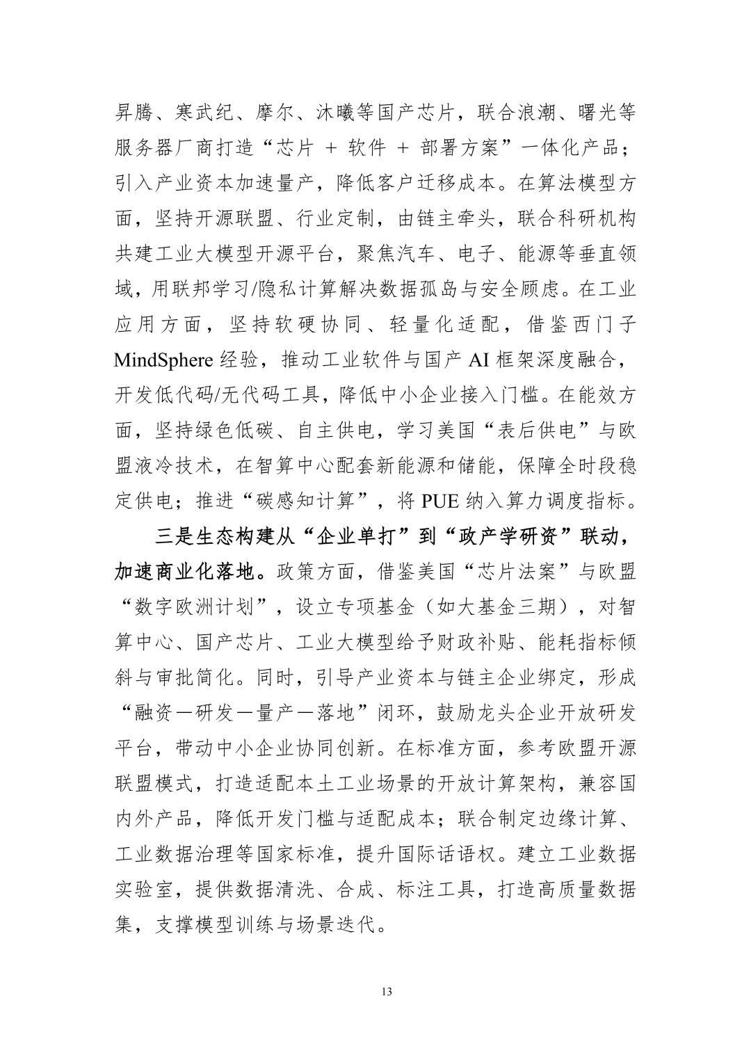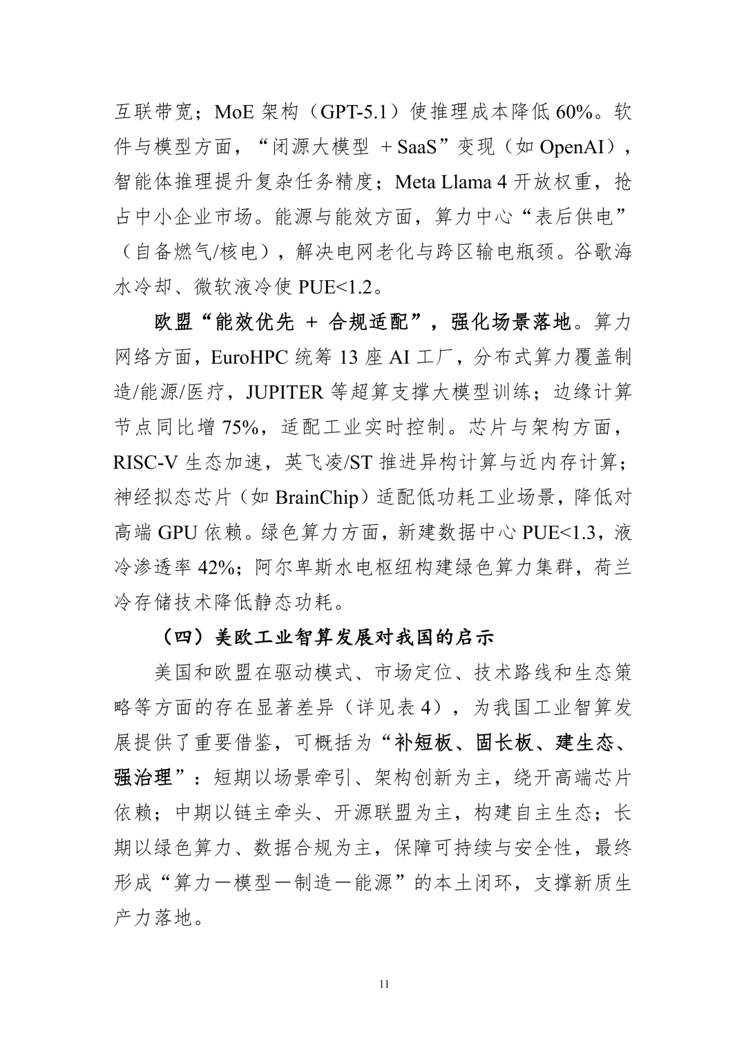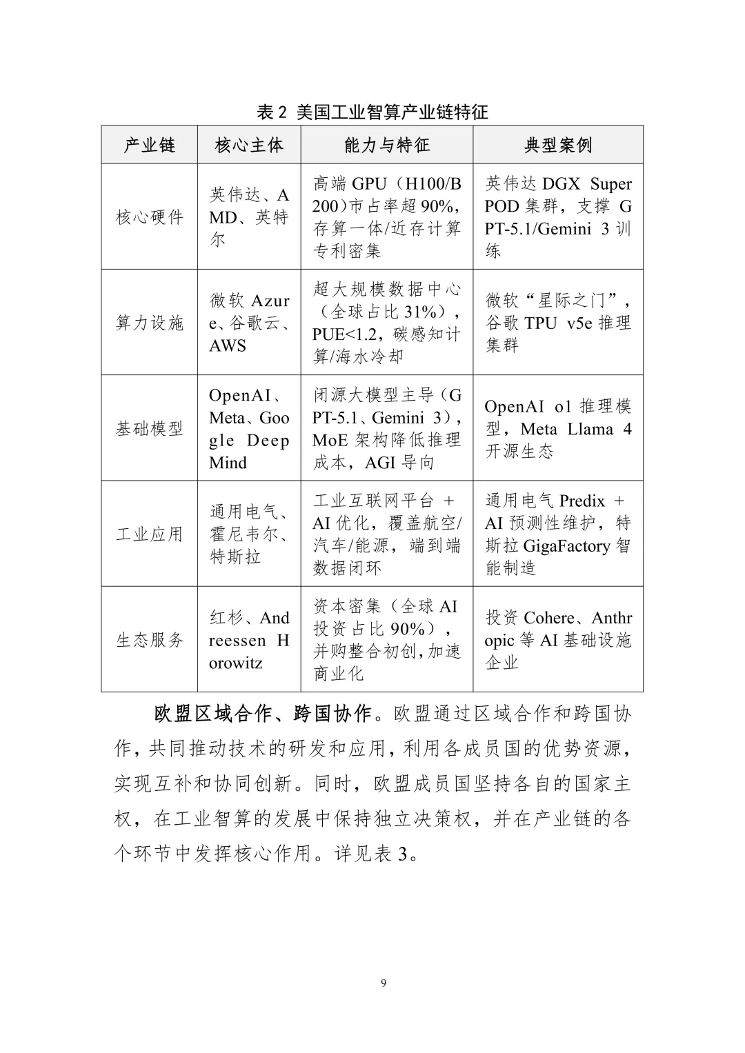 在全球格局中,美欧工业智算发展路径各具特色。美国以企业主导、政府补贴为驱动,凭借 “暴力算力 + 架构创新” 追求极限性能,形成寡头主导的垂直整合产业链,聚焦全球市场与技术垄断;欧盟则通过政策牵引、成员国协同,以 “能效优先 + 合规适配” 强化场景落地,构建分布式协同的产业链生态,优先服务本土中小企业与国家主权。截至 2025 年 8 月,美国在全球 AI 算力中占比 68.9%,中国以 14.5% 位列第二,美欧经验为我国提供了 “补短板、固长板、建生态、强治理” 的清晰发展路线。