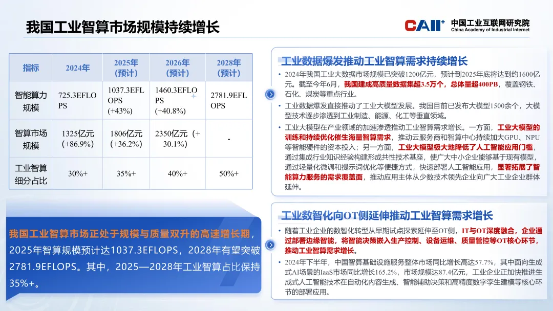我国工业智算正处于规模与质量双升的高速增长期。市场规模方面,2024 年智能算力规模达 725.3EFLOPS,智算市场规模 1325 亿元,工业智算细分占比超 30%;预计 2025 年智能算力将增至 1037.3EFLOPS,2028 年突破 2781.9EFLOPS,工业智算占比届时将超 50%。需求增长主要源于两大动力:一是工业数据爆发式增长,2024 年工业大数据市场规模突破 1200 亿元,1500 余个工业大模型向垂直领域渗透,既催生海量算力需求,又降低中小企业应用门槛;二是工业数智化向 OT 侧延伸,IT 与 OT 深度融合,生成式 AI 在工业场景的应用推动智算基础设施服务快速增长。