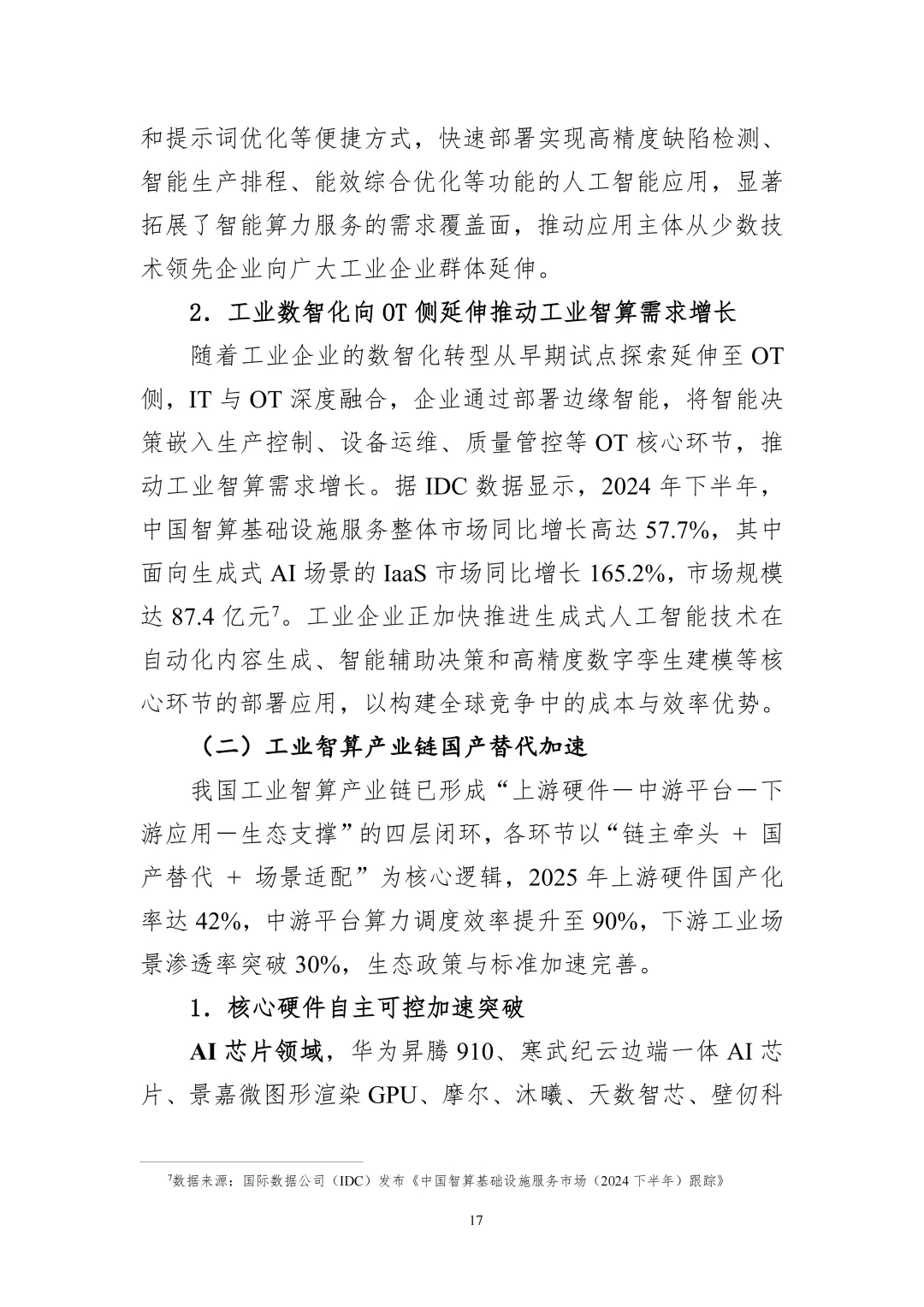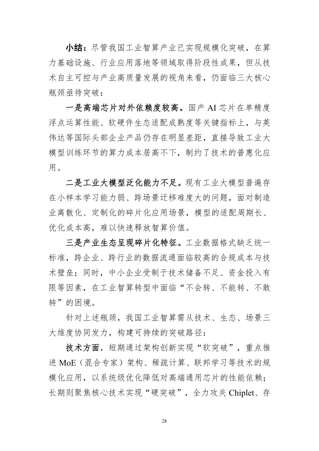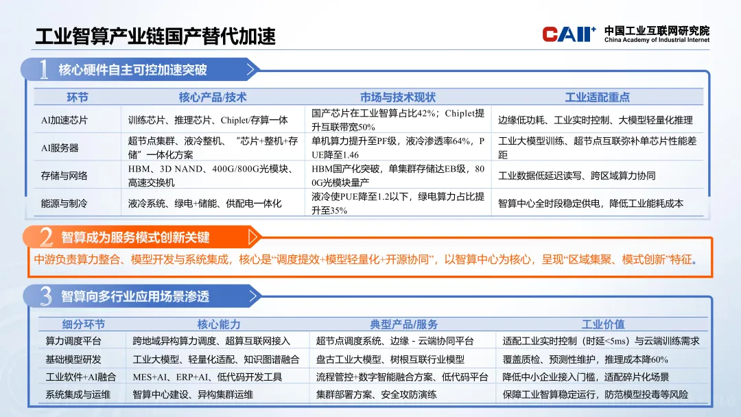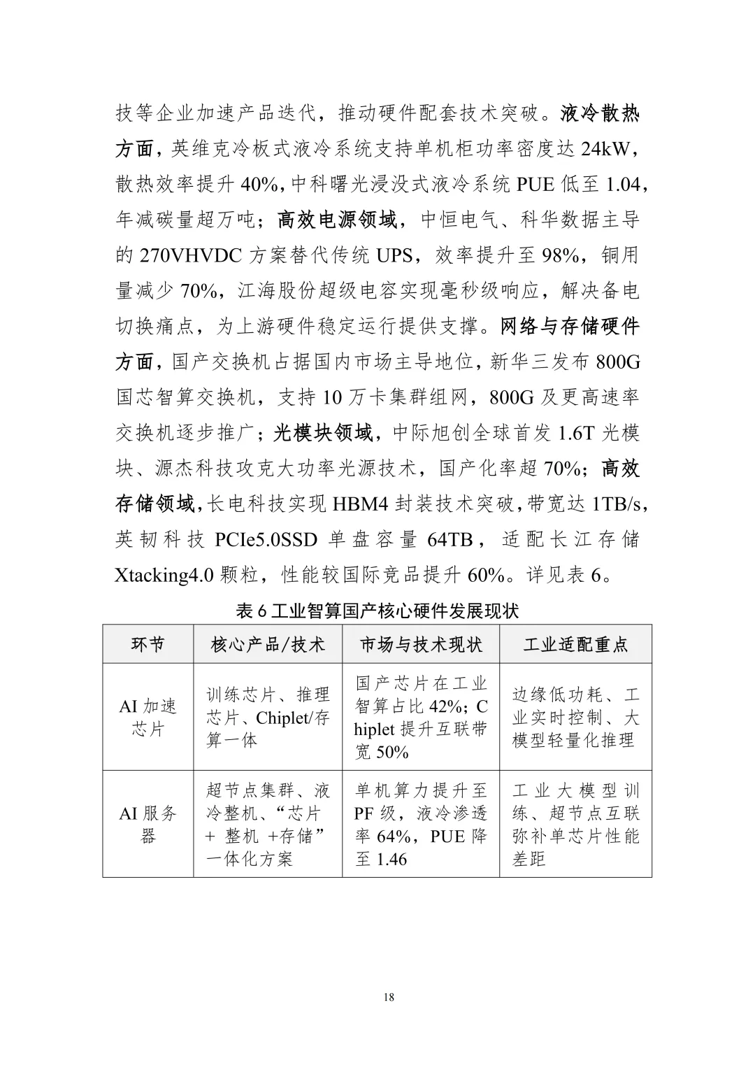 产业发展层面,我国工业智算产业链国产替代加速推进。核心硬件领域,国产 AI 芯片在工业智算占比达 42%,液冷服务器渗透率 64%,HBM、800G 光模块等实现国产化突破;中游算力整合与系统集成环节,形成 “调度提效 + 模型轻量化 + 开源协同” 核心能力,算力调度平台、工业大模型、AI 融合工业软件等产品有效适配工业场景需求。技术适配持续完善,“超节点 + 异构调度 + 软硬协同” 架构满足训推一体需求,“5G + 确定性网络 + 边缘节点协同” 打通工业 “最后一公里”,国产操作系统与 AI 框架适配不断深化。应用渗透方面,工业智算已在汽车制造、航空航天、能源、电子制造等行业落地,推动生产线柔性升级、产品创新周期缩短、缺陷检测精准化等变革。