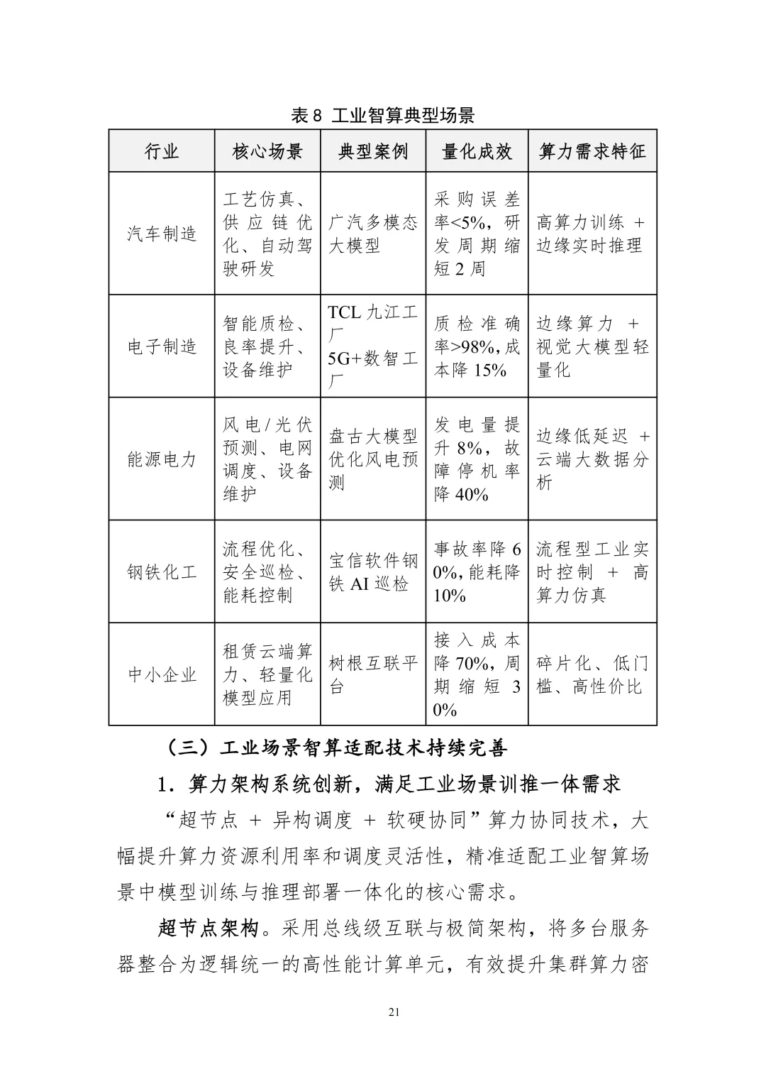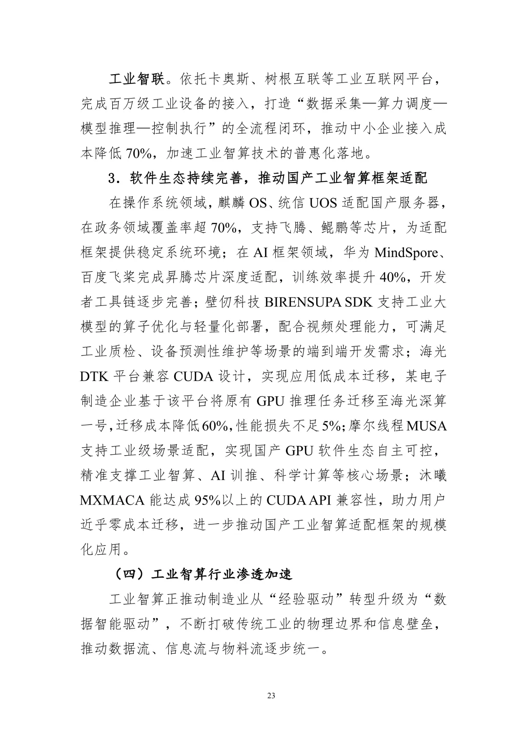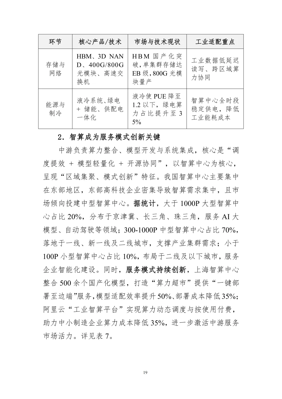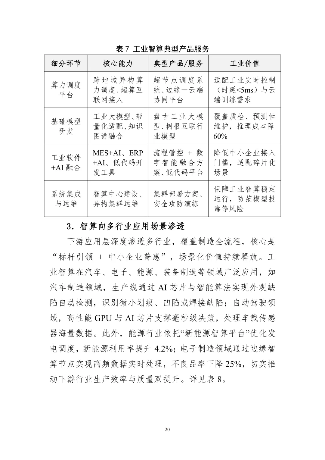 产业发展层面,我国工业智算产业链国产替代加速推进。核心硬件领域,国产 AI 芯片在工业智算占比达 42%,液冷服务器渗透率 64%,HBM、800G 光模块等实现国产化突破;中游算力整合与系统集成环节,形成 “调度提效 + 模型轻量化 + 开源协同” 核心能力,算力调度平台、工业大模型、AI 融合工业软件等产品有效适配工业场景需求。技术适配持续完善,“超节点 + 异构调度 + 软硬协同” 架构满足训推一体需求,“5G + 确定性网络 + 边缘节点协同” 打通工业 “最后一公里”,国产操作系统与 AI 框架适配不断深化。应用渗透方面,工业智算已在汽车制造、航空航天、能源、电子制造等行业落地,推动生产线柔性升级、产品创新周期缩短、缺陷检测精准化等变革。