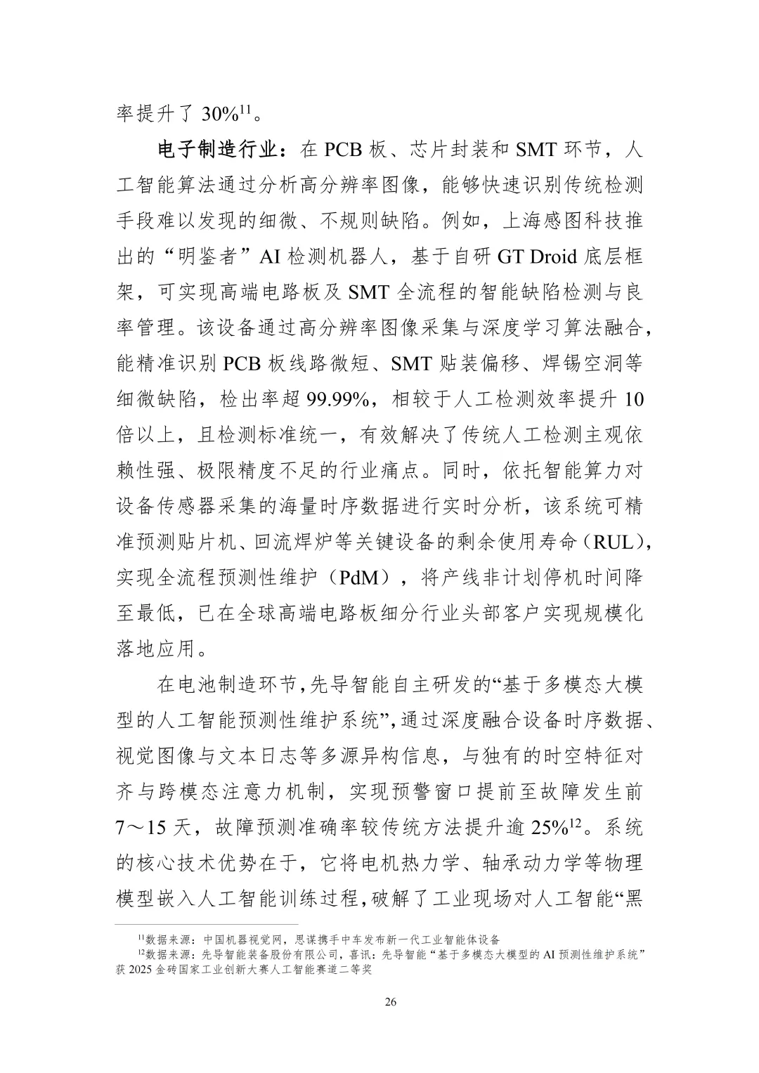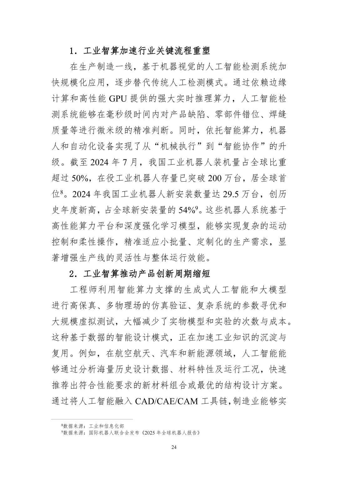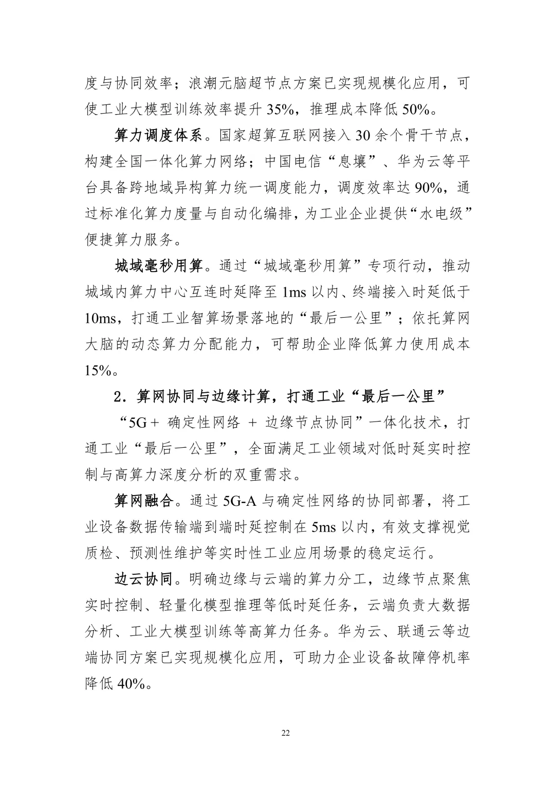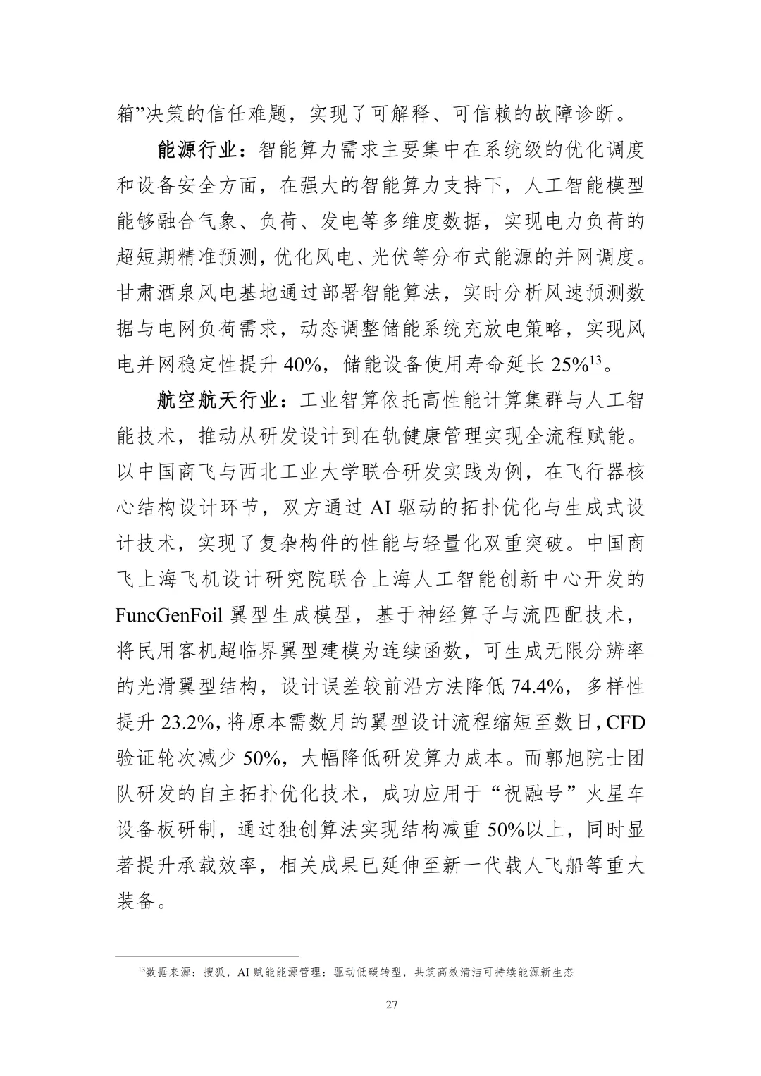 产业发展层面,我国工业智算产业链国产替代加速推进。核心硬件领域,国产 AI 芯片在工业智算占比达 42%,液冷服务器渗透率 64%,HBM、800G 光模块等实现国产化突破;中游算力整合与系统集成环节,形成 “调度提效 + 模型轻量化 + 开源协同” 核心能力,算力调度平台、工业大模型、AI 融合工业软件等产品有效适配工业场景需求。技术适配持续完善,“超节点 + 异构调度 + 软硬协同” 架构满足训推一体需求,“5G + 确定性网络 + 边缘节点协同” 打通工业 “最后一公里”,国产操作系统与 AI 框架适配不断深化。应用渗透方面,工业智算已在汽车制造、航空航天、能源、电子制造等行业落地,推动生产线柔性升级、产品创新周期缩短、缺陷检测精准化等变革。