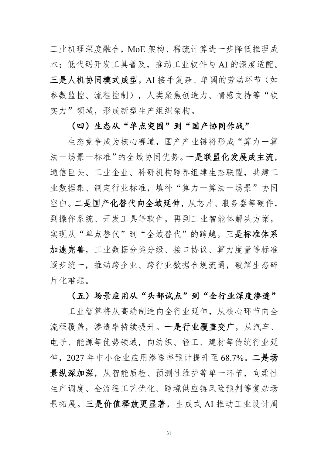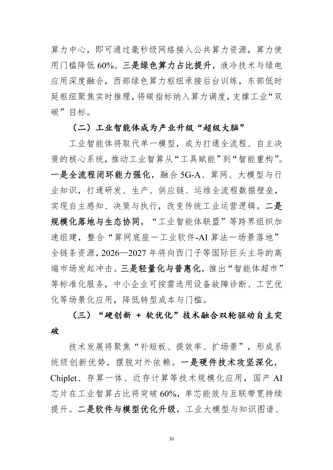 未来,工业智算将呈现四大核心趋势:一是算力网络从 “分布式布局” 走向 “毫秒级全域协同”,算网一体服务普及,绿色算力占比持续提升;二是工业智能体规模化发展,全流程闭环能力强化,形成轻量化、普惠化服务模式;三是国产生态从 “单点突围” 转向 “协同作战”,联盟化发展成为主流,标准体系逐步完善;四是场景应用从 “头部试点” 向 “全行业深度渗透”,向纺织、轻工等传统行业延伸,在能耗优化、安全管控等领域释放更大价值。2026-2027 年将成为工业智算 “技术融合爆发 + 生态协同突围” 的关键阶段,为我国新型工业化提供全面支撑。