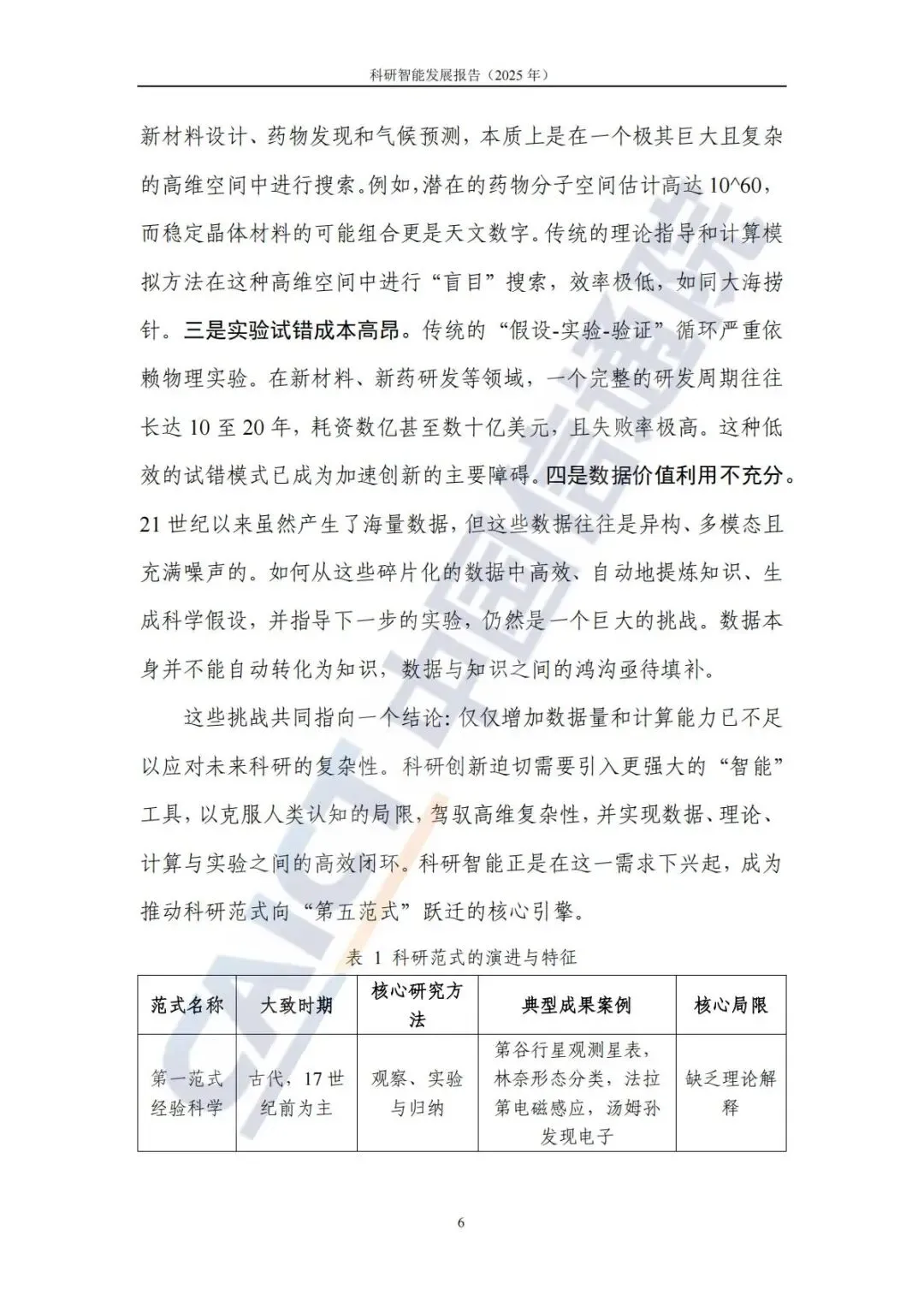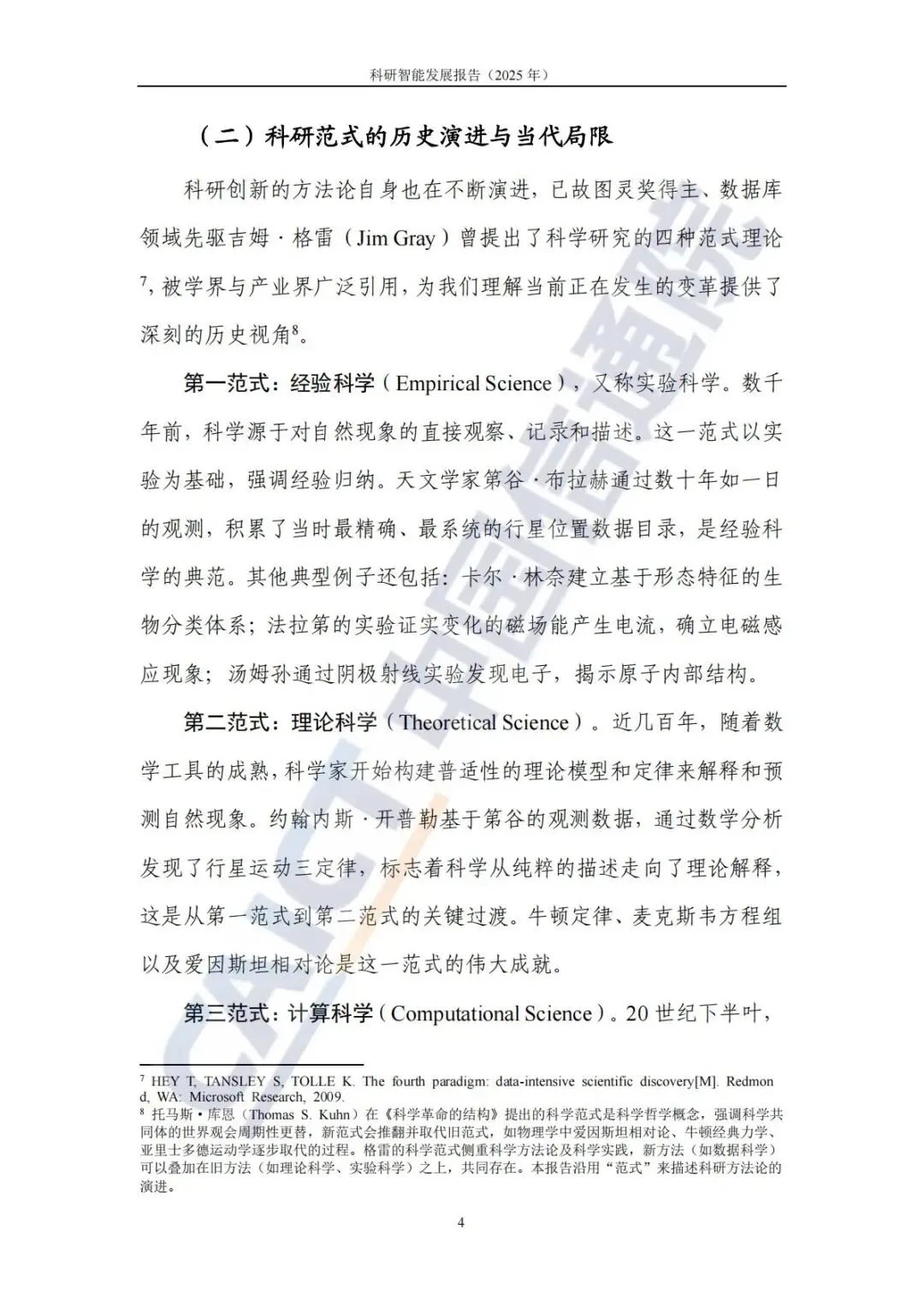 根据报告梳理,科研范式经历了四个历史阶段的演进: