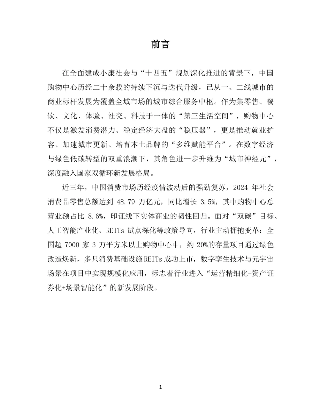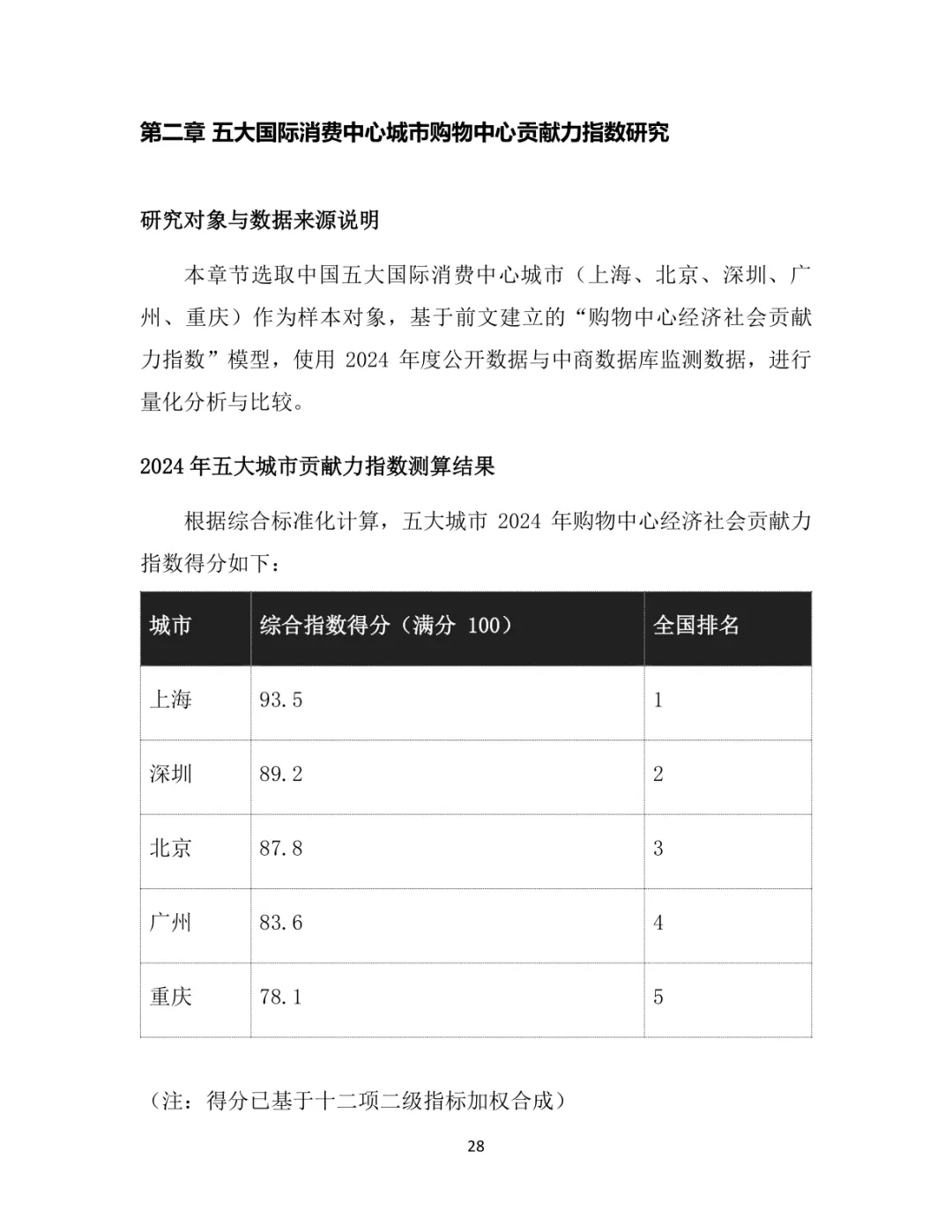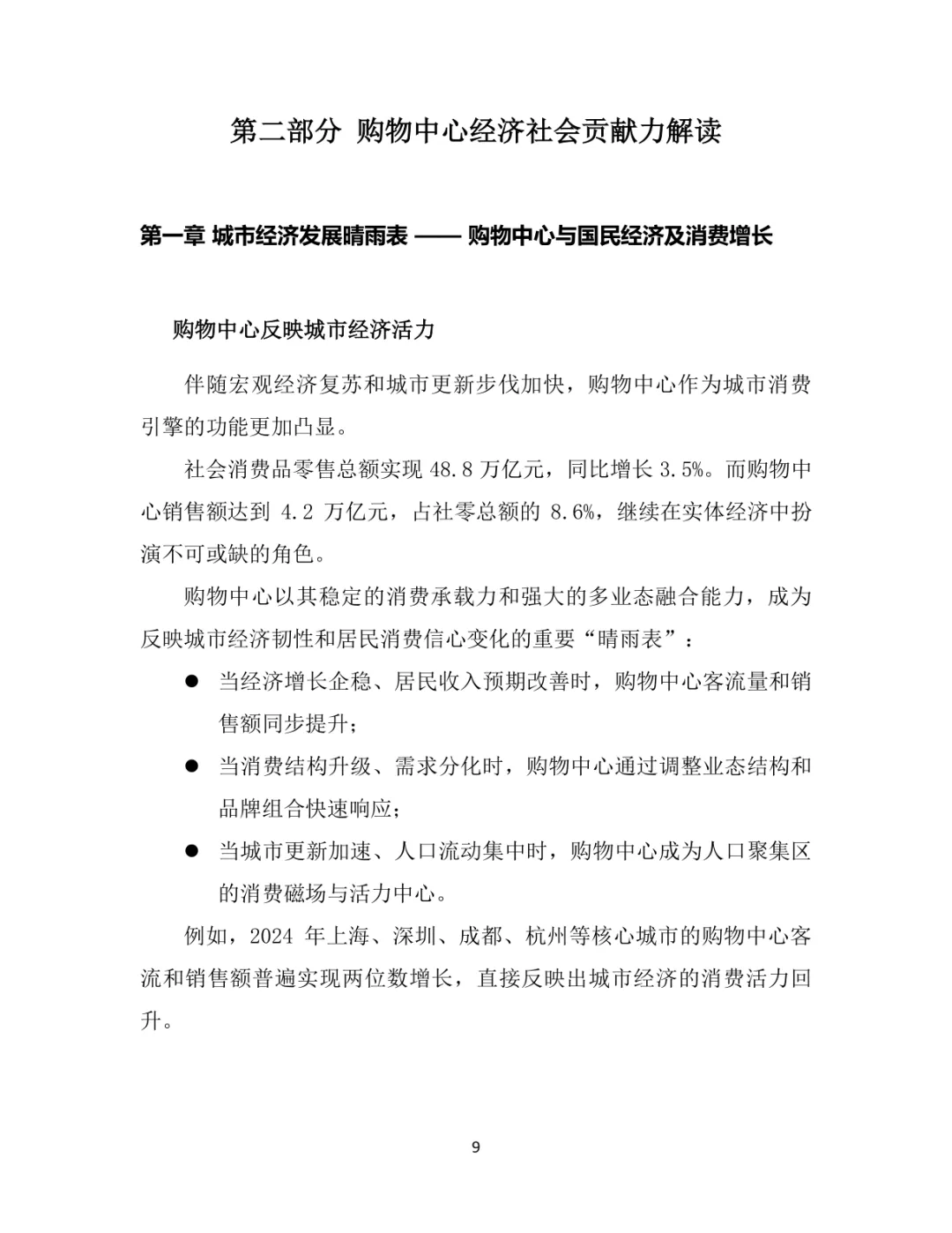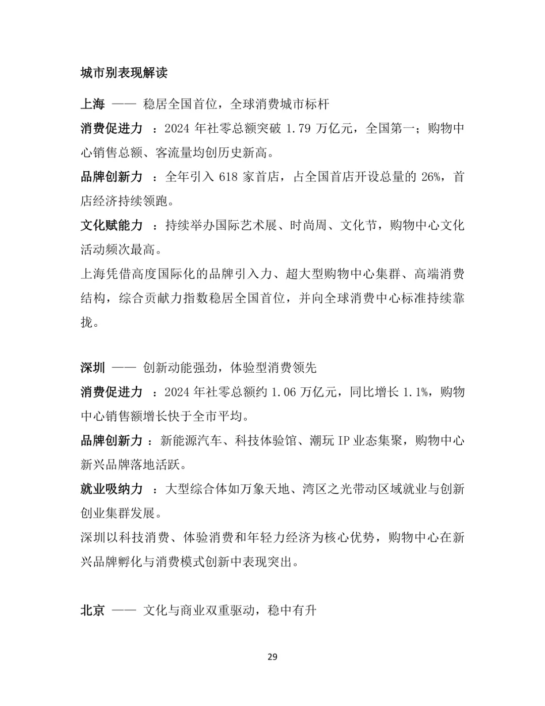 导读:报告聚焦中国购物中心的多元价值,基于全国 7000 余个 3 万平方米以上项目样本,系统呈现其对经济社会的综合贡献。2024 年,全国购物中心营业额达 4.2 万亿元,占社会消费品零售总额 8.6%,直接提供就业岗位 1180 万个,衍生岗位超 2000 万个,日均客流超 1.33 亿人次,成为稳定内需与就业的核心支柱。购物中心功能持续升级,从零售终端转型为 “第三生活空间”。超 320 个项目引入文化艺术空间,首店数量增长 12.7%,20% 存量项目通过绿色改造焕新,数字化与绿色低碳转型成效显著。在城市更新中,购物中心通过存量改造、片区赋能等模式,激活老旧城区活力,重塑城市空间价值。五大国际消费中心城市中,上海以 93.5 分位居贡献力指数榜首,深圳、北京紧随其后。报告提出应明确购物中心消费基础设施定位,优化土地、金融、税收政策,推动行业从规模扩张向质量提升转型,持续释放其在消费促进、文化传播、民生保障等领域的综合价值。
