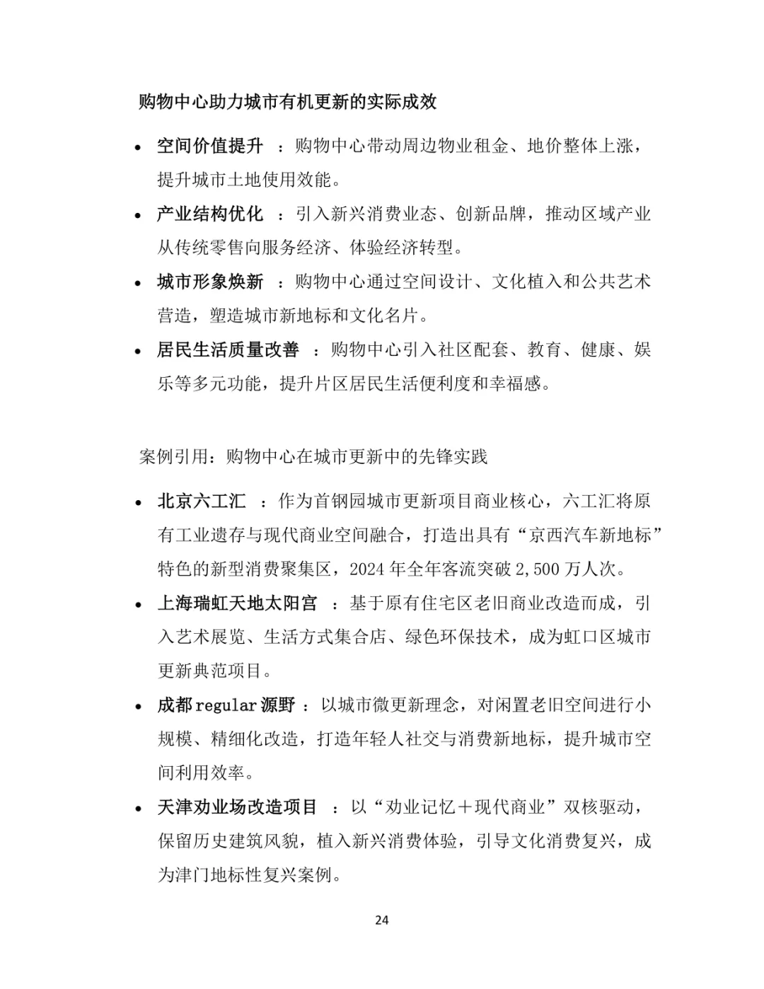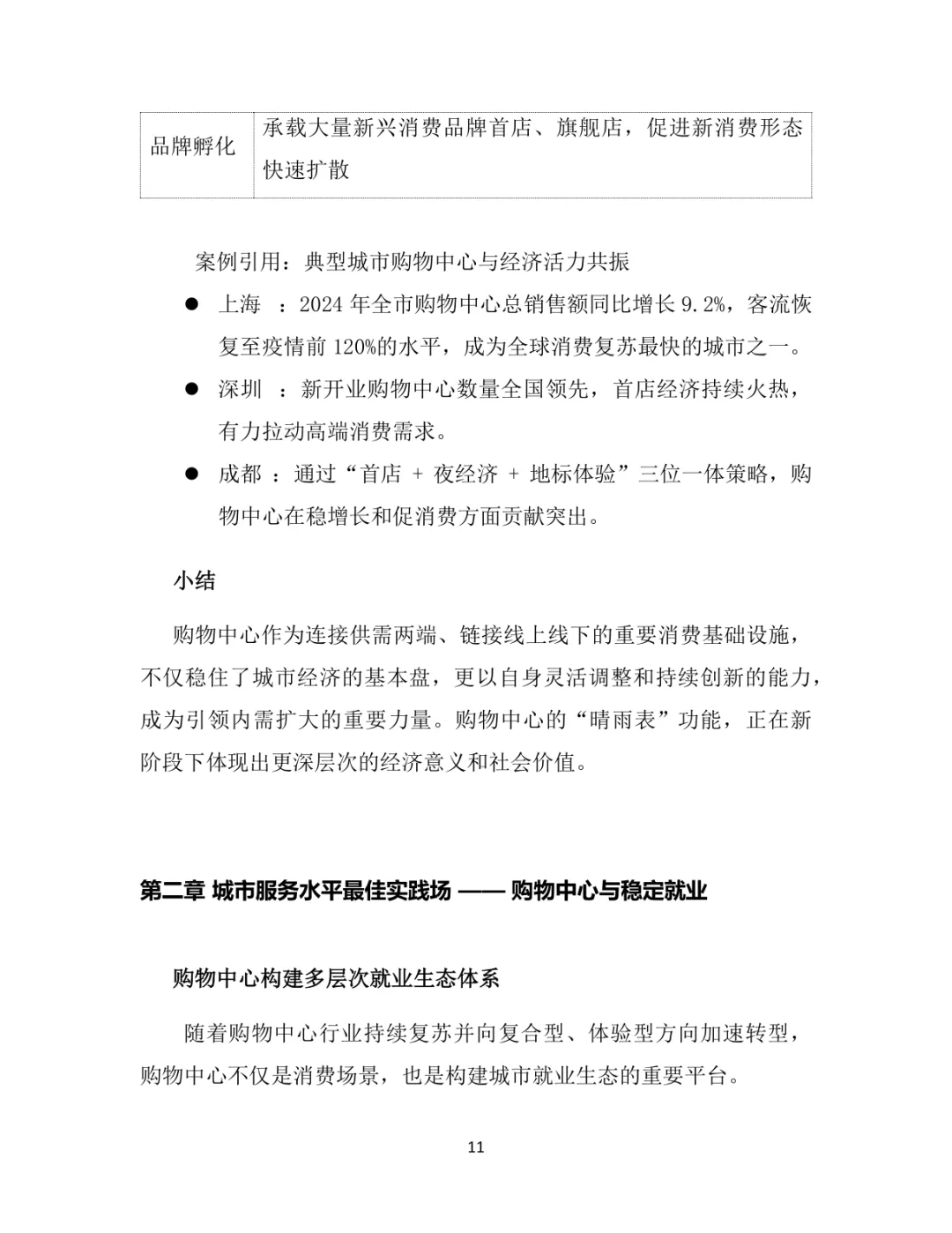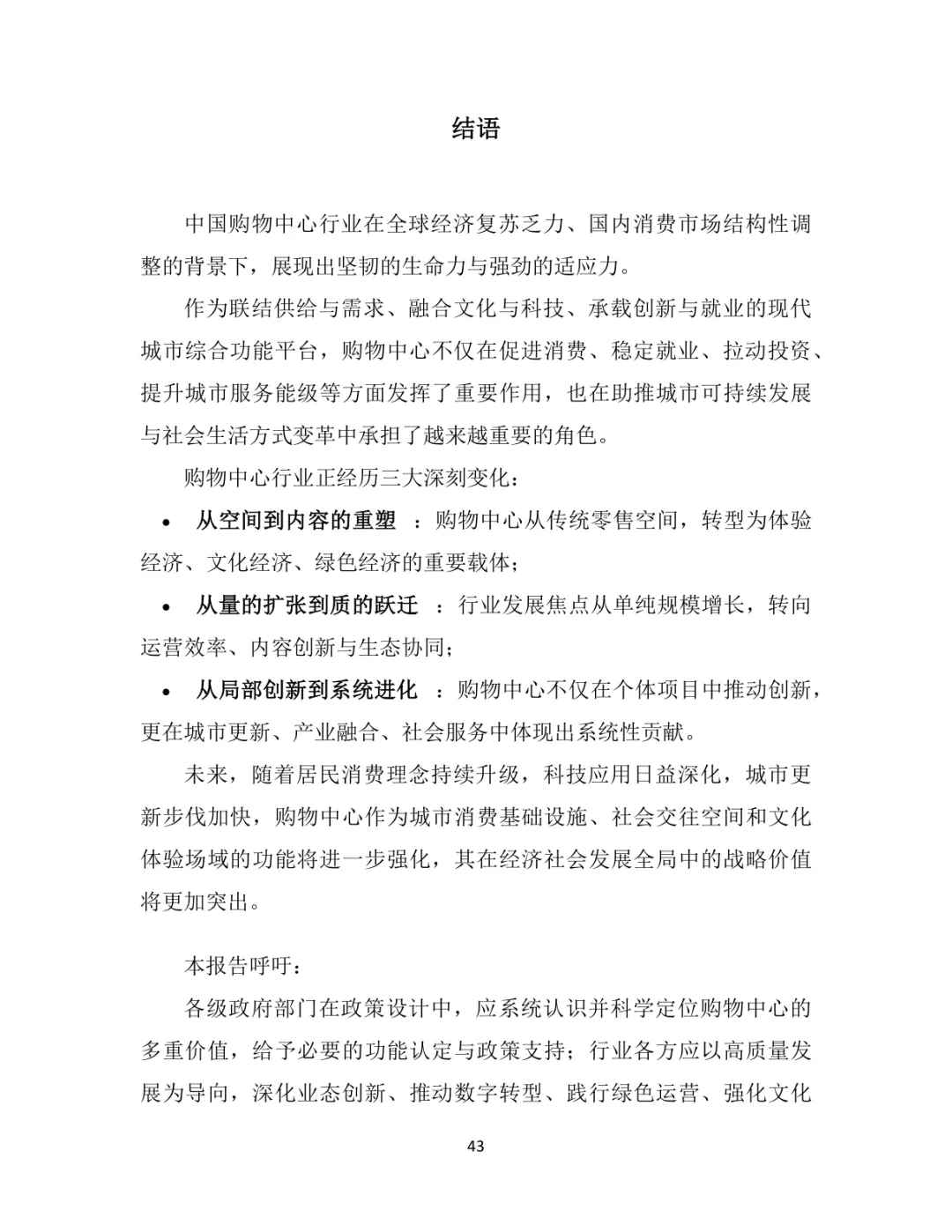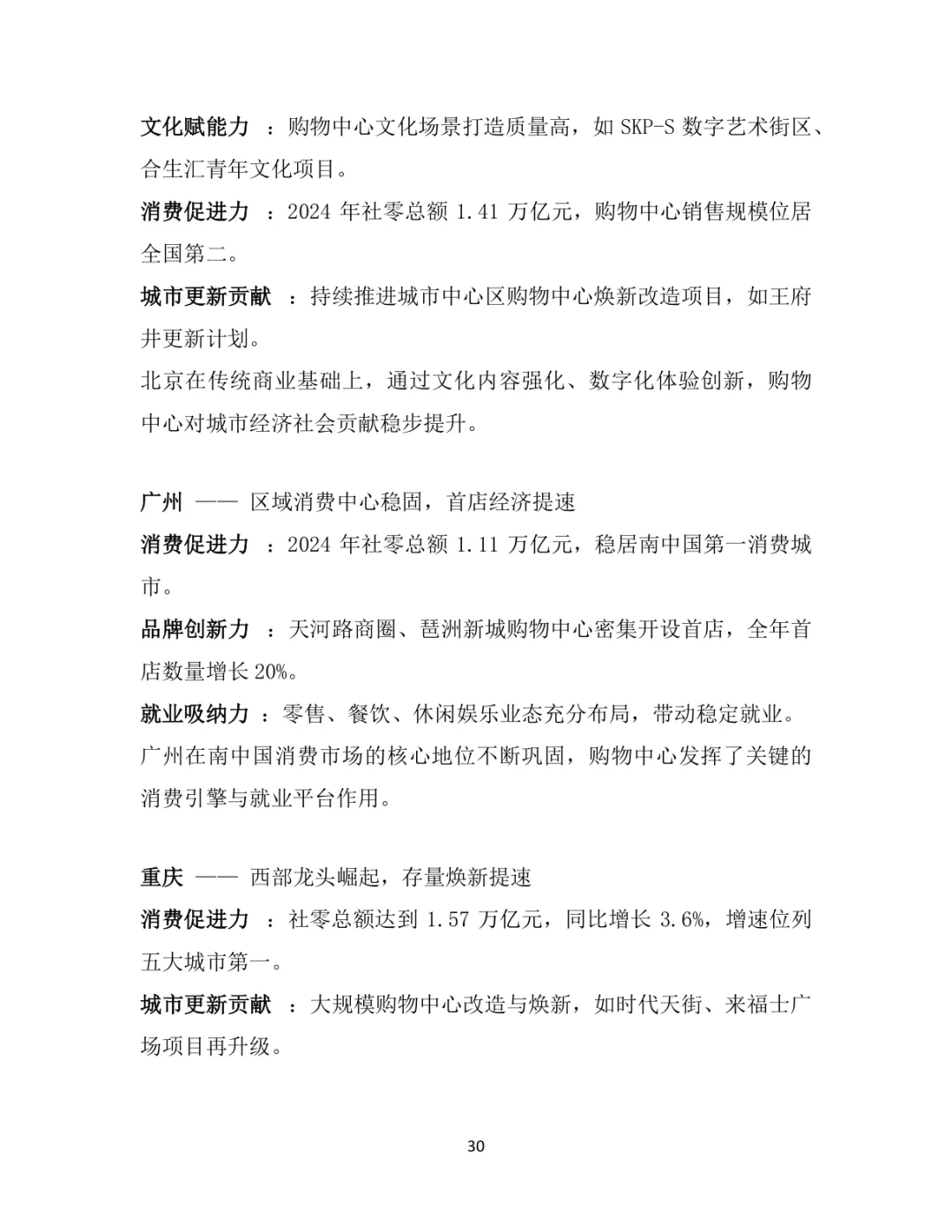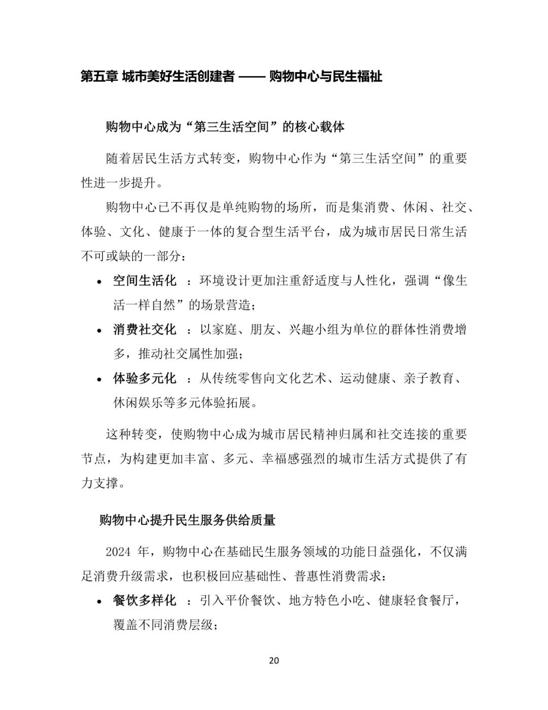 导读:报告聚焦中国购物中心的多元价值,基于全国 7000 余个 3 万平方米以上项目样本,系统呈现其对经济社会的综合贡献。2024 年,全国购物中心营业额达 4.2 万亿元,占社会消费品零售总额 8.6%,直接提供就业岗位 1180 万个,衍生岗位超 2000 万个,日均客流超 1.33 亿人次,成为稳定内需与就业的核心支柱。购物中心功能持续升级,从零售终端转型为 “第三生活空间”。超 320 个项目引入文化艺术空间,首店数量增长 12.7%,20% 存量项目通过绿色改造焕新,数字化与绿色低碳转型成效显著。在城市更新中,购物中心通过存量改造、片区赋能等模式,激活老旧城区活力,重塑城市空间价值。五大国际消费中心城市中,上海以 93.5 分位居贡献力指数榜首,深圳、北京紧随其后。报告提出应明确购物中心消费基础设施定位,优化土地、金融、税收政策,推动行业从规模扩张向质量提升转型,持续释放其在消费促进、文化传播、民生保障等领域的综合价值。