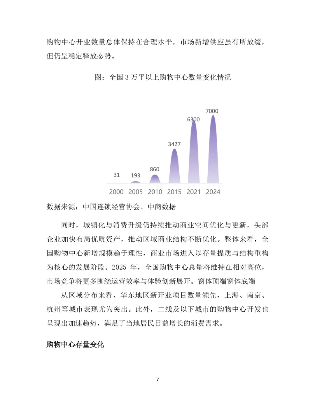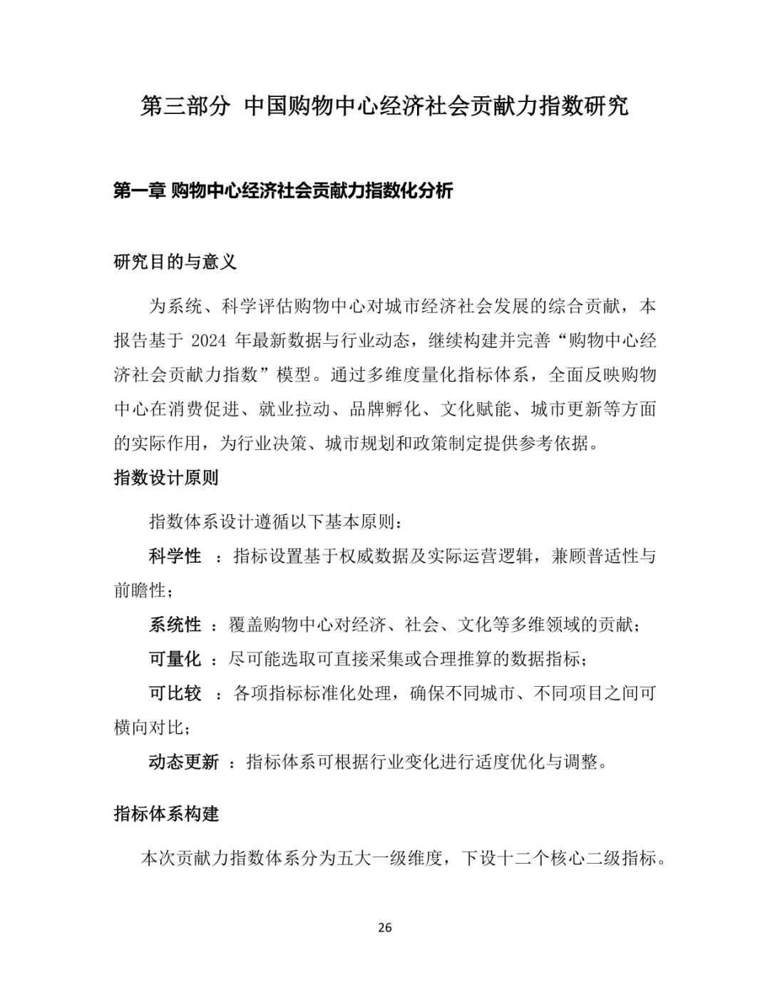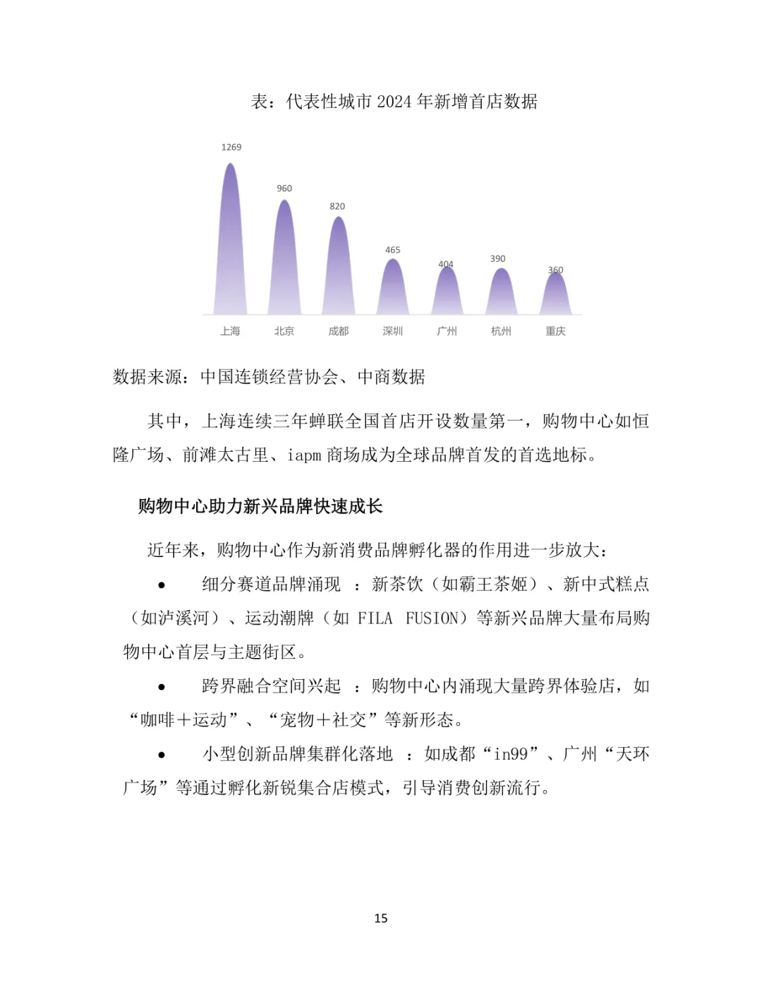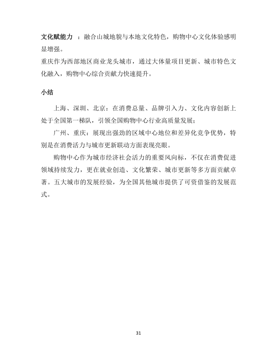 导读:报告聚焦中国购物中心的多元价值,基于全国 7000 余个 3 万平方米以上项目样本,系统呈现其对经济社会的综合贡献。2024 年,全国购物中心营业额达 4.2 万亿元,占社会消费品零售总额 8.6%,直接提供就业岗位 1180 万个,衍生岗位超 2000 万个,日均客流超 1.33 亿人次,成为稳定内需与就业的核心支柱。购物中心功能持续升级,从零售终端转型为 “第三生活空间”。超 320 个项目引入文化艺术空间,首店数量增长 12.7%,20% 存量项目通过绿色改造焕新,数字化与绿色低碳转型成效显著。在城市更新中,购物中心通过存量改造、片区赋能等模式,激活老旧城区活力,重塑城市空间价值。五大国际消费中心城市中,上海以 93.5 分位居贡献力指数榜首,深圳、北京紧随其后。报告提出应明确购物中心消费基础设施定位,优化土地、金融、税收政策,推动行业从规模扩张向质量提升转型,持续释放其在消费促进、文化传播、民生保障等领域的综合价值。