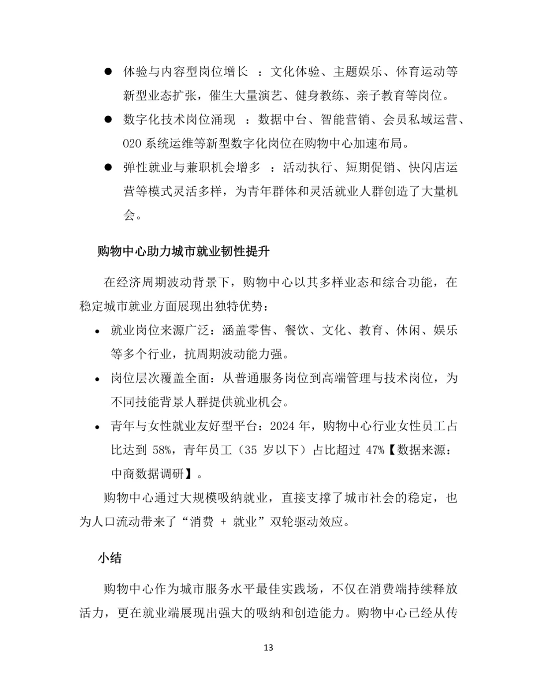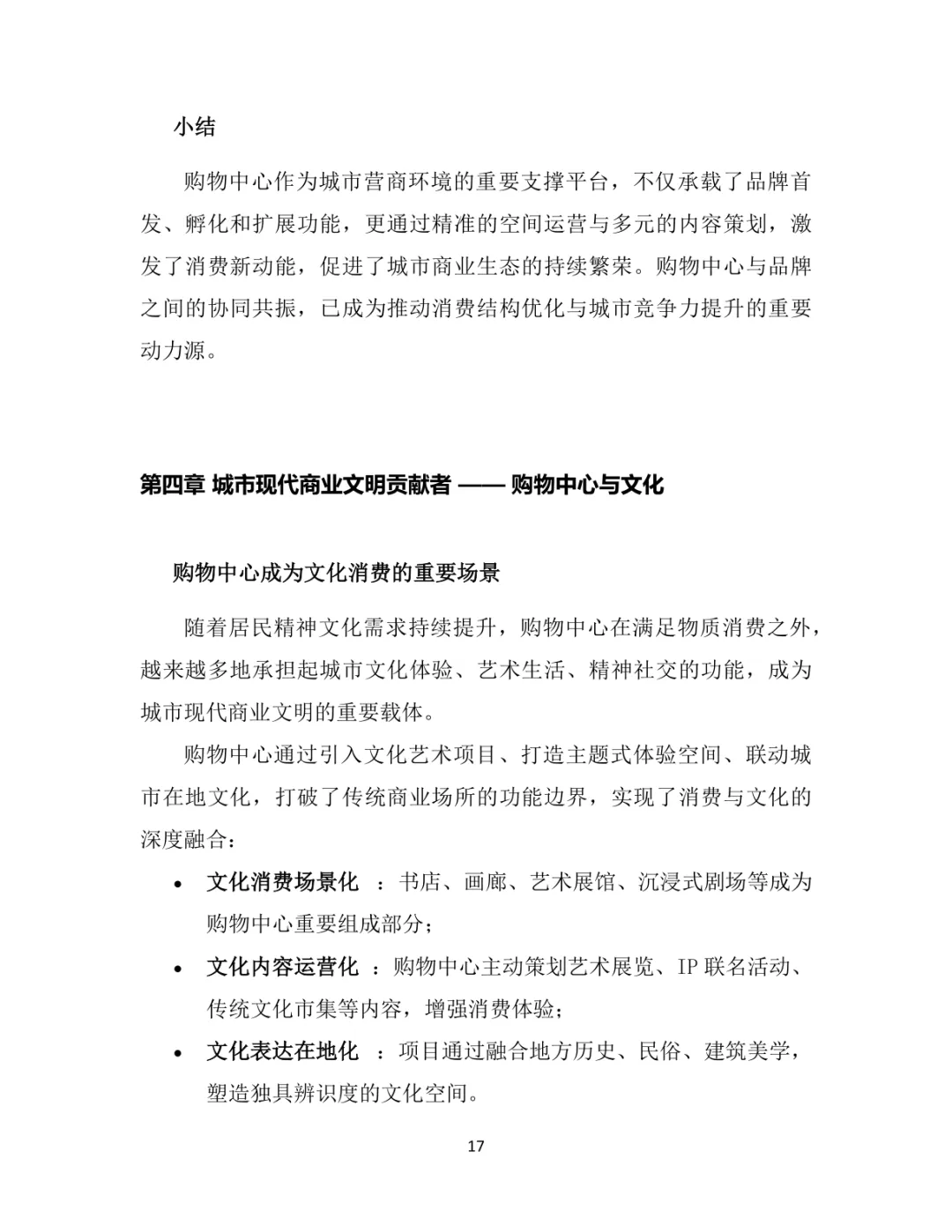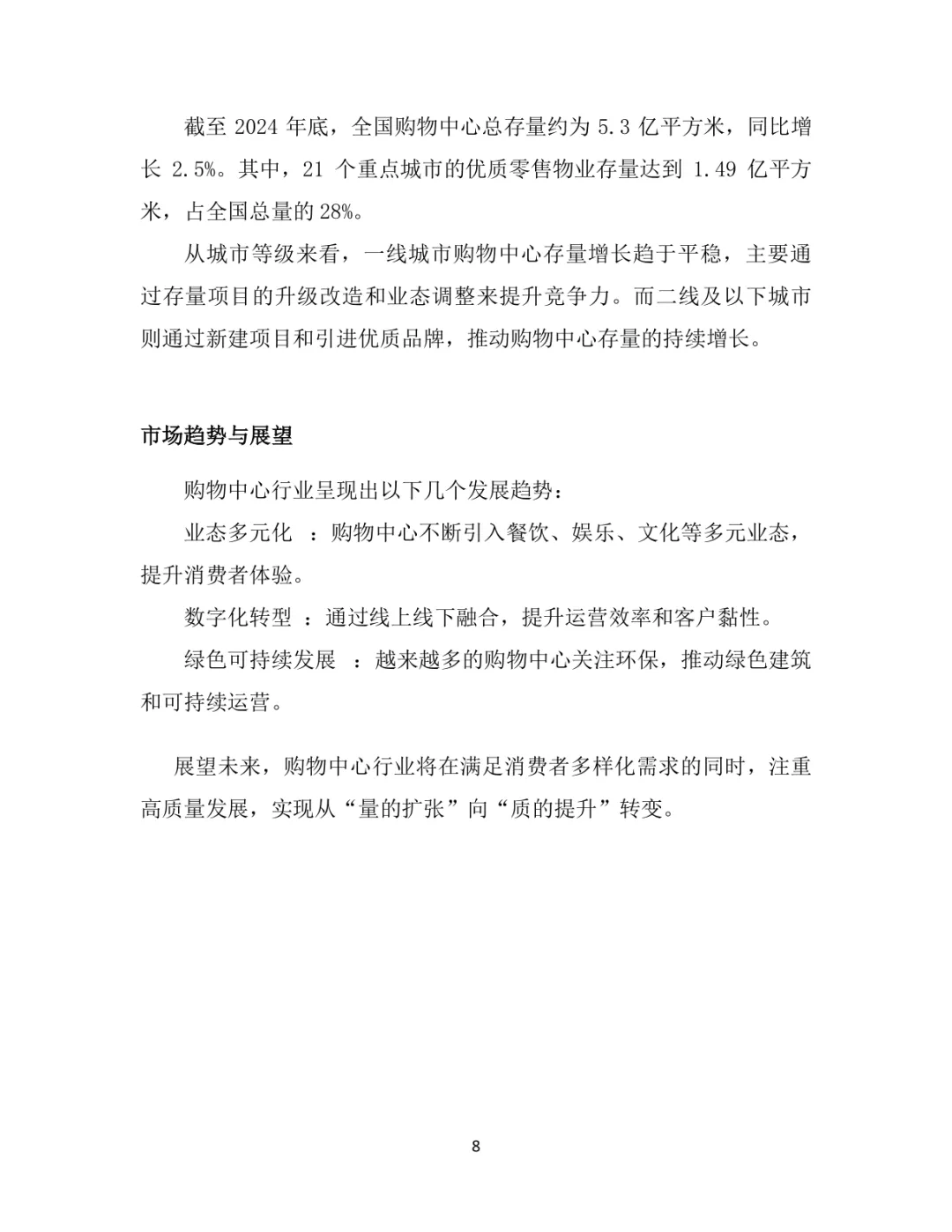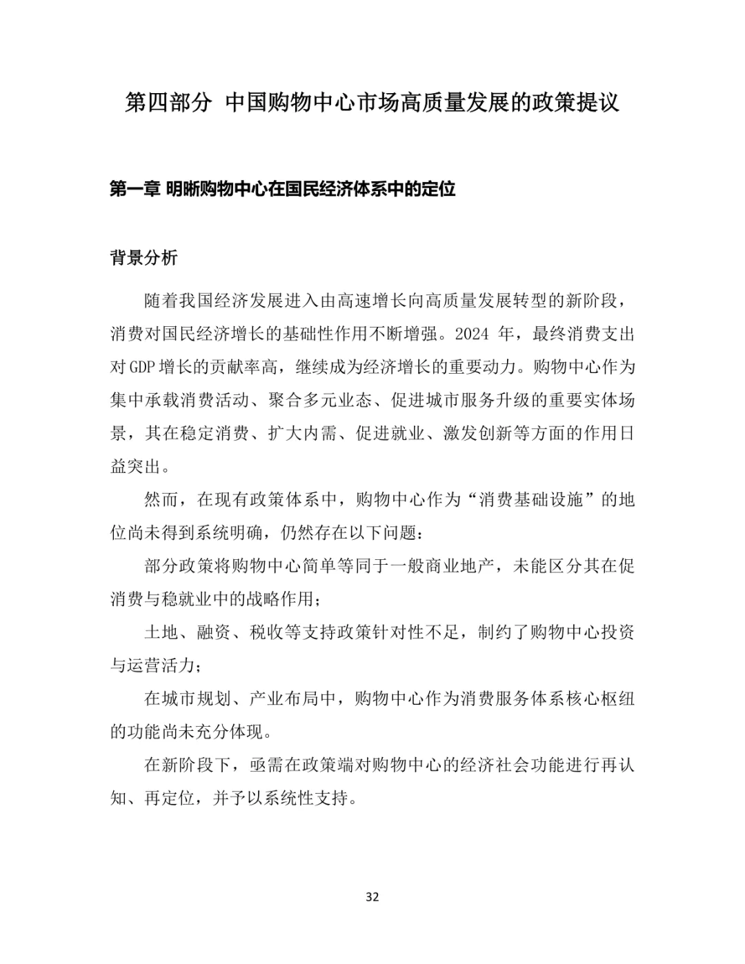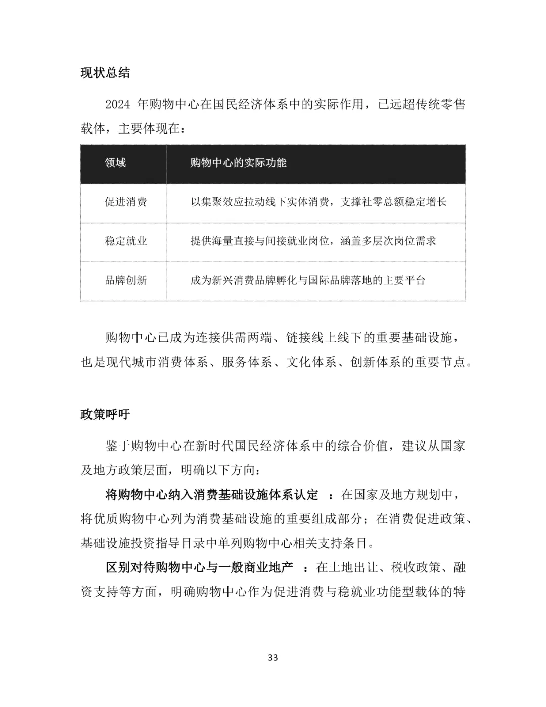 导读:报告聚焦中国购物中心的多元价值,基于全国 7000 余个 3 万平方米以上项目样本,系统呈现其对经济社会的综合贡献。2024 年,全国购物中心营业额达 4.2 万亿元,占社会消费品零售总额 8.6%,直接提供就业岗位 1180 万个,衍生岗位超 2000 万个,日均客流超 1.33 亿人次,成为稳定内需与就业的核心支柱。购物中心功能持续升级,从零售终端转型为 “第三生活空间”。超 320 个项目引入文化艺术空间,首店数量增长 12.7%,20% 存量项目通过绿色改造焕新,数字化与绿色低碳转型成效显著。在城市更新中,购物中心通过存量改造、片区赋能等模式,激活老旧城区活力,重塑城市空间价值。五大国际消费中心城市中,上海以 93.5 分位居贡献力指数榜首,深圳、北京紧随其后。报告提出应明确购物中心消费基础设施定位,优化土地、金融、税收政策,推动行业从规模扩张向质量提升转型,持续释放其在消费促进、文化传播、民生保障等领域的综合价值。