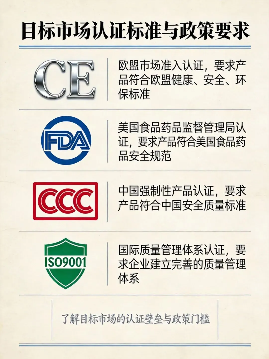 核心观点:不同国家和地区对产品的认证标准和政策要求存在差异,企业在进入目标市场前,必须了解并满足当地的认证和政策要求,避免因合规问题导致订单失败。