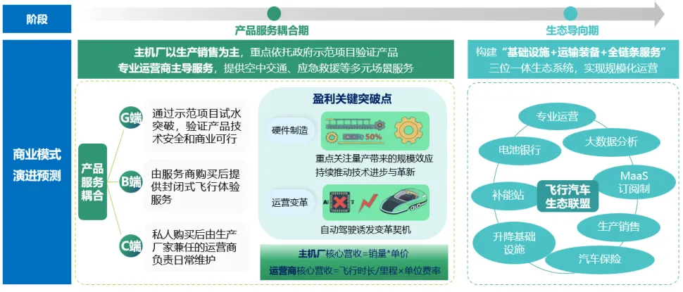 飞行汽车商业模式将沿“耦合产品服务→闭环生态”两阶段演化,最终通过共享运营和平台化服务,构建可持续的立体出行价值网络。