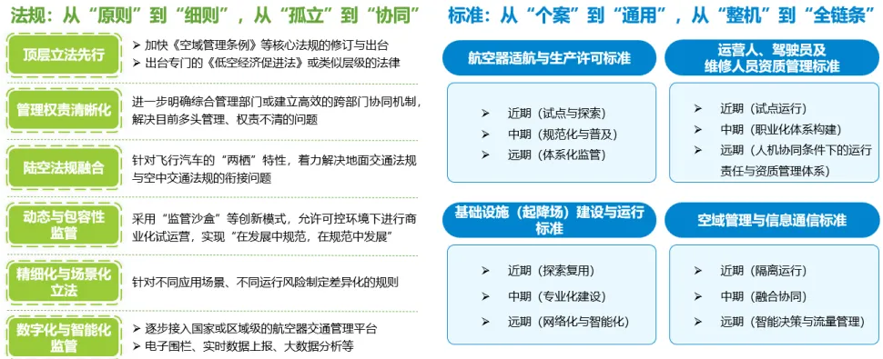 未来飞行汽车法规将从“原则性许可”走向“以风险为导向的精细化管理”,构建多部门协同的综合性法规体系;标准将从“个案审定”走向“可复用的通用规范“,建立覆盖全生命周期的分级分类标准簇。